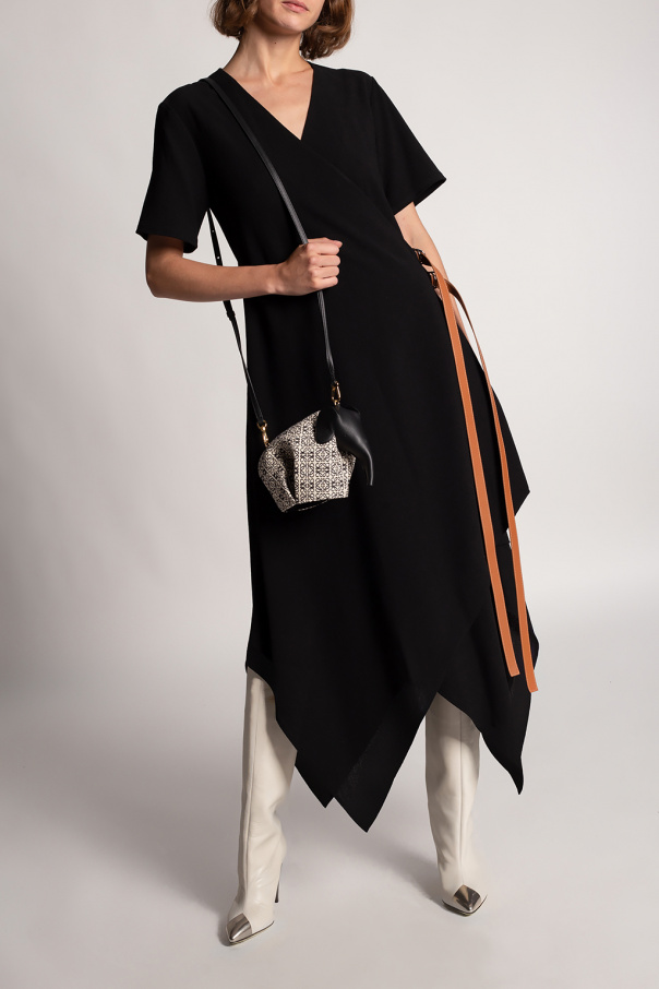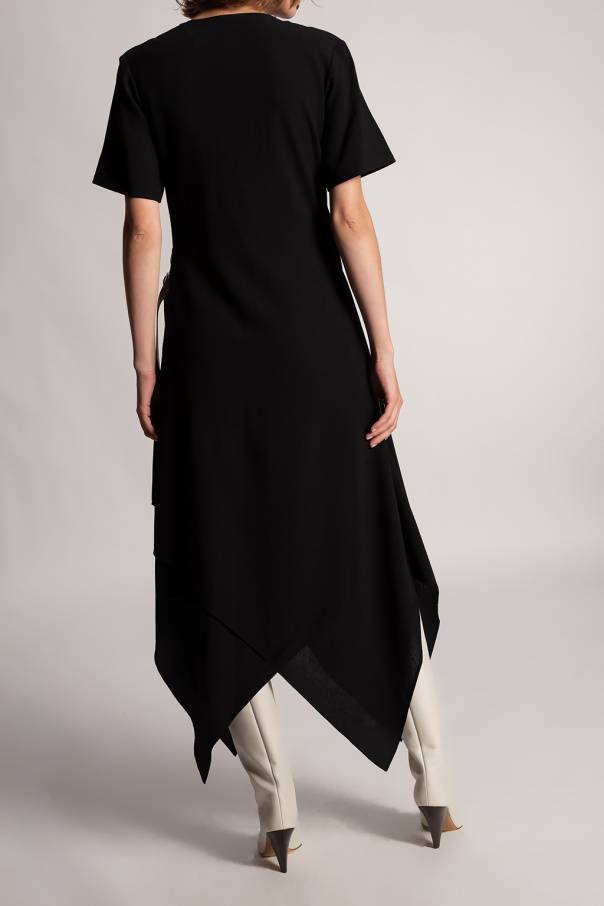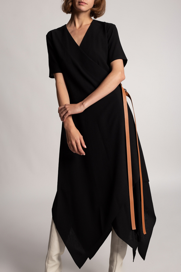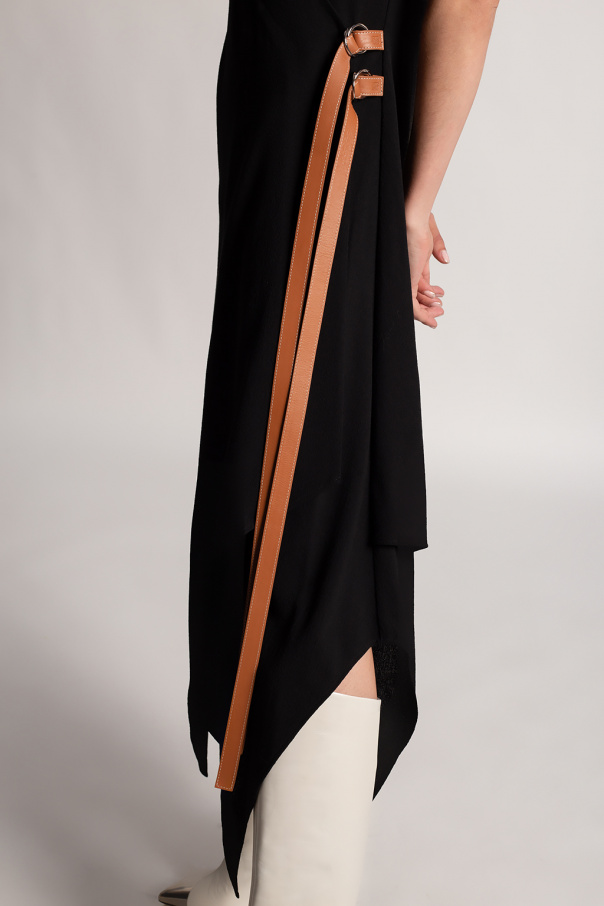 Black dress from Loewe. Crafted from wool with an asymmetrical hem, this style showcases a V-shaped neckline, short sleeves and double leather straps with an embossed logo and silver-tone D rings.