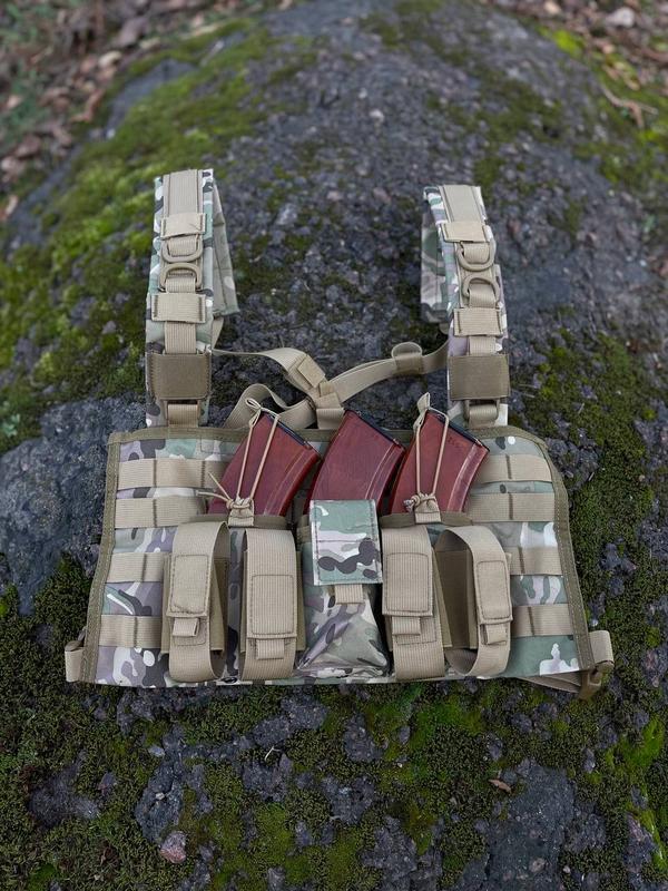 Включает в себя три подсумка под магазины АК/АR. Четыре подсумка под гранаты. Подсумок под рацию.Материал: кордура