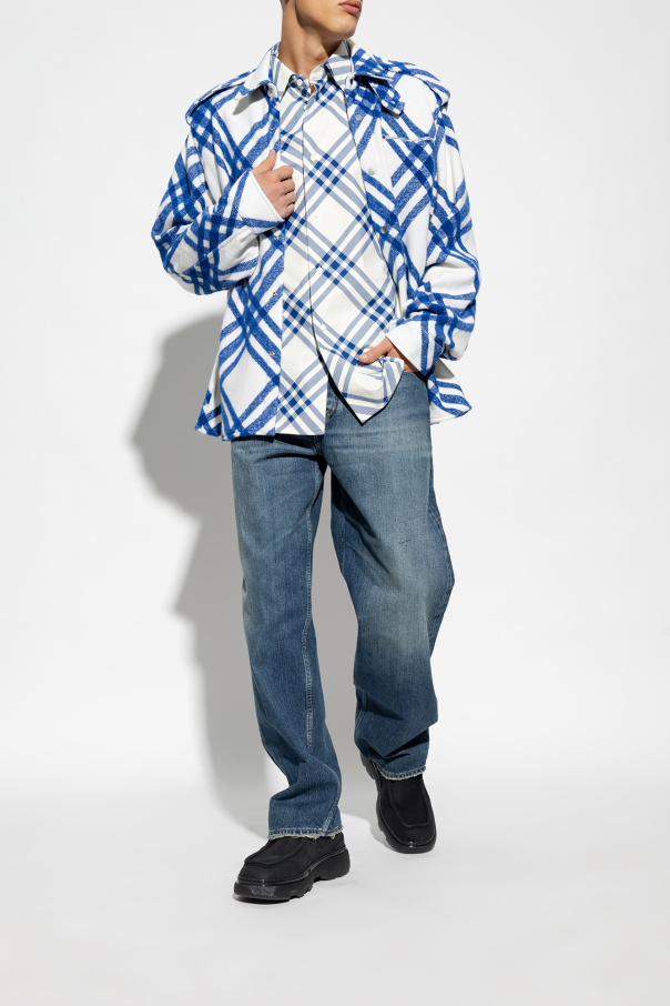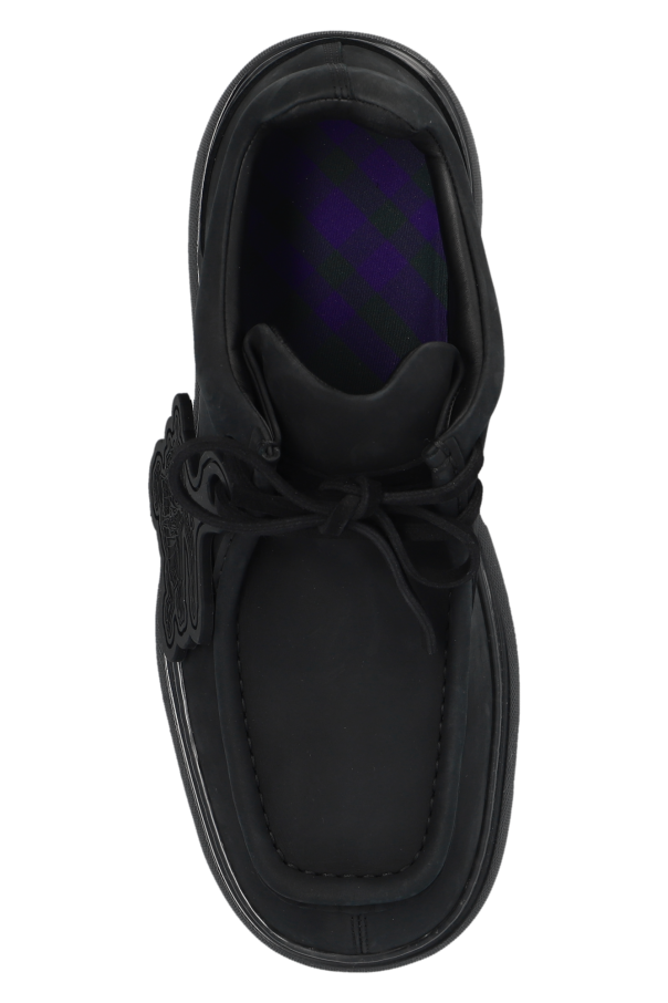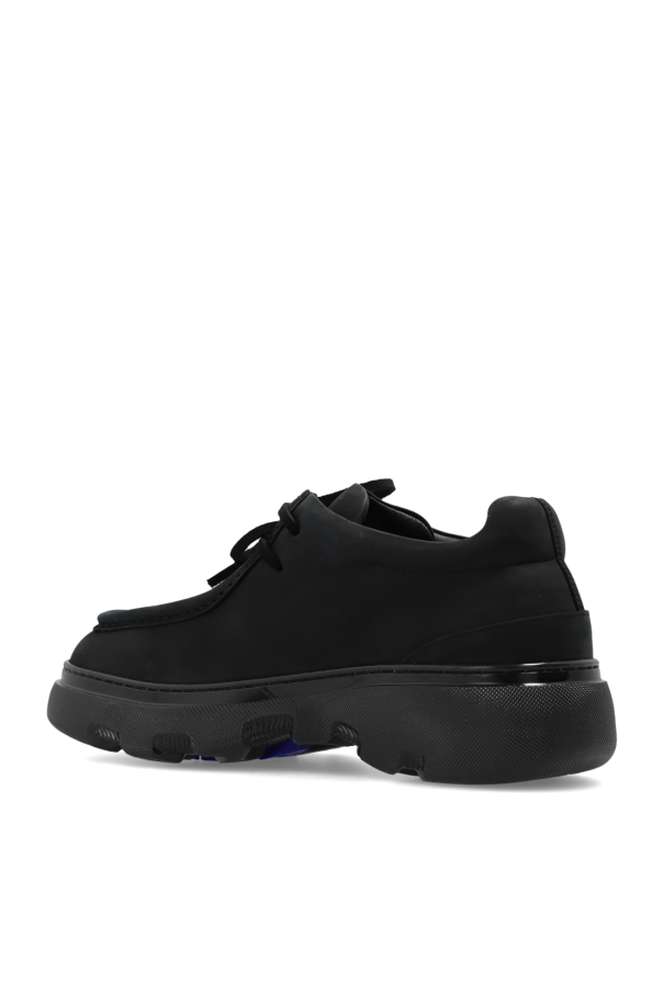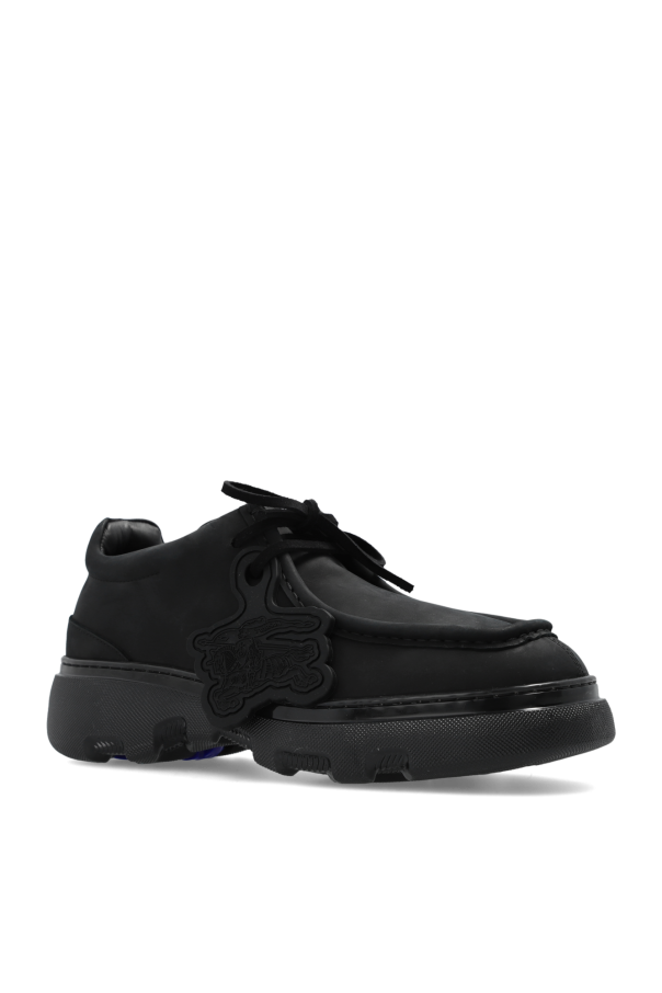 Black shoes from Burberry. Crafted from leather, this lace-up pair sits on a black and blue rubber sole and is decorated with a logo-embossed silicon charm.