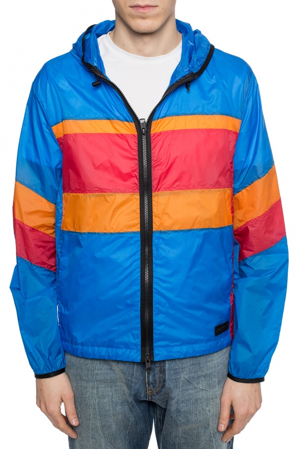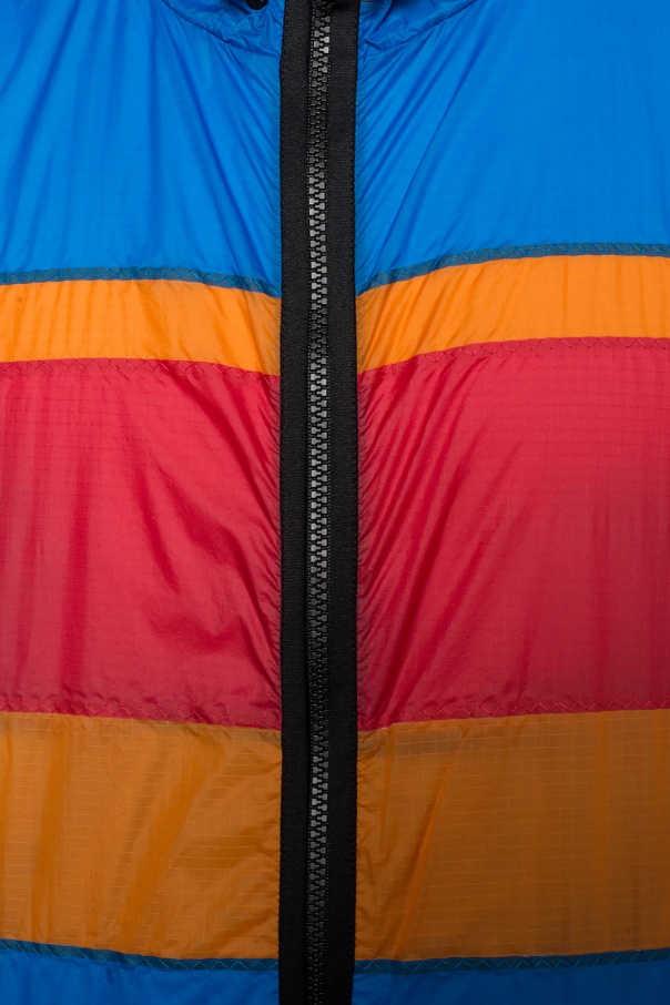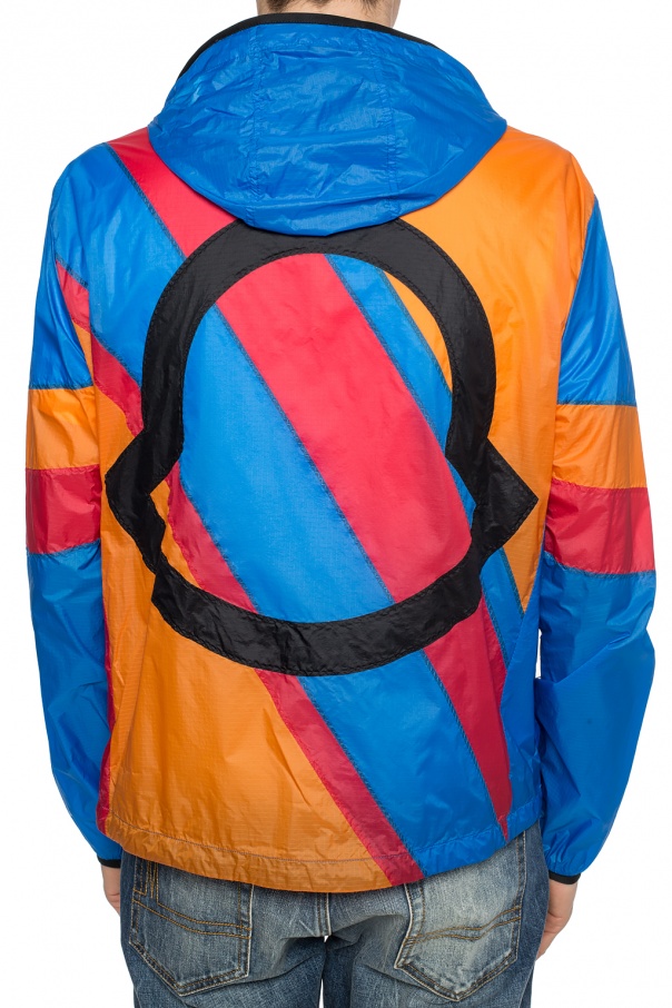 Colorful rain jacket from Moncler Genius, The design is part of the ‘5 Moncler Craig Green’ collection. Fastened with a two-way zip. Decorated with a print and a logo patch. Two snap pockets on the front. Drawstring hood and bottom hem. Long sleeves with ribbed cuffs.