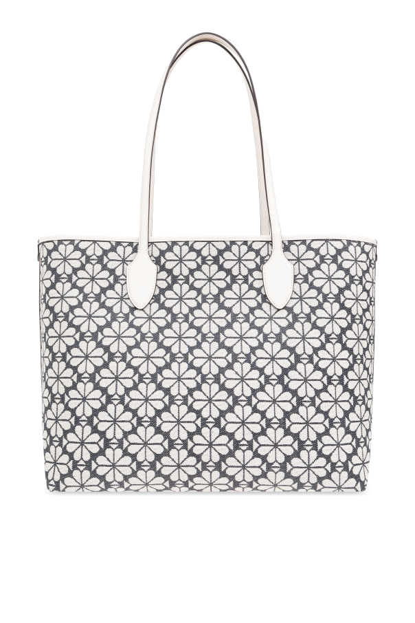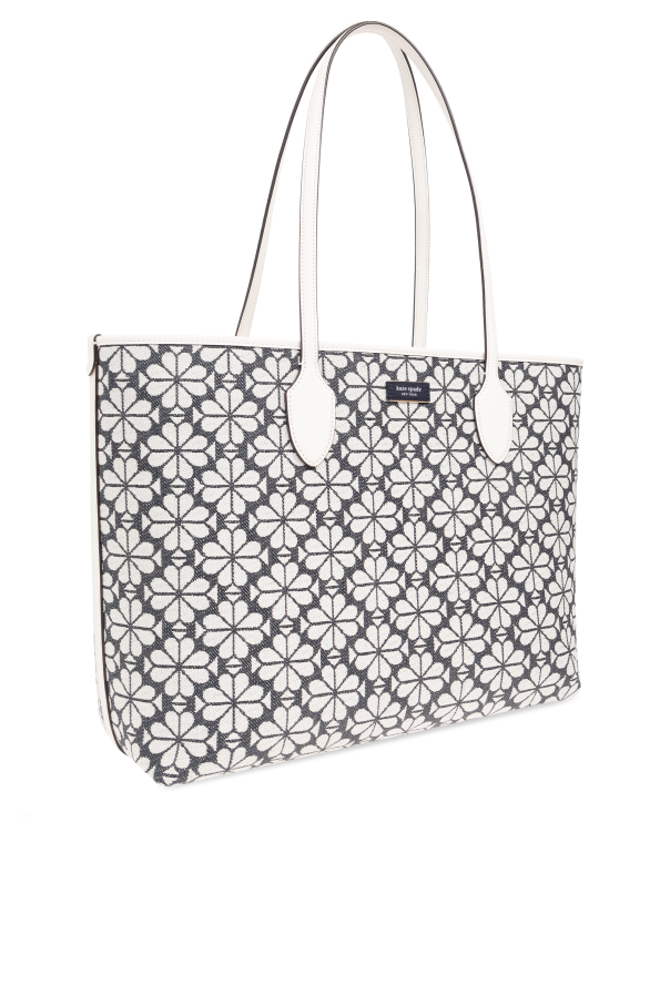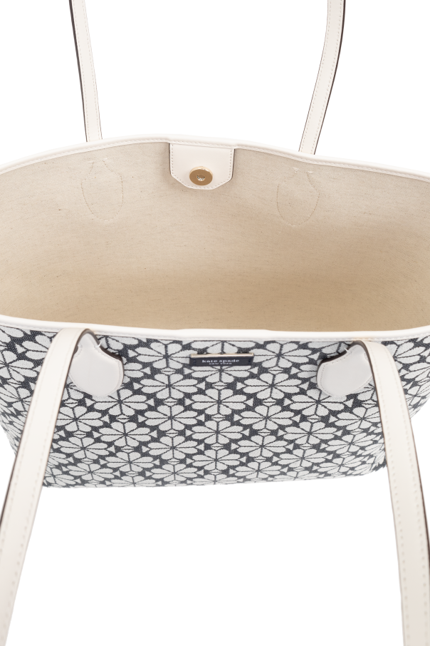 Introducing the Kate Spade \'Flower\' Shopper, a harmonious blend of functionality and aesthetic appeal. This exquisitely designed tote is a testament to the sophisticated simplicity that marks Kate Spade\'s creations. The bag\'s surface is adorned with a mesmerizing, geometric floral pattern in shades of gray, set against a canvas that beautifully interplays with contrasting white handles and edges. Crafted from premium quality materials, the \'Flower\' shopper promises durability and a smooth texture that speaks volumes of its high-end craftsmanship. Its long, flat, white handles are thoughtfully designed to offer comfort and ease, allowing the bag to be gracefully carried over the shoulder. Noteworthy details include a small rectangular designer logo tag on the front panel, adding a signature touch to its refined design. Additionally, the bag features a white, flat, rectangular pocket for convenient storage of small items, enhancing its practicality. The tote is secured with a magnetic snap closure, ensuring your belongings are safely contained while providing easy access. Why Purchase This Product? Exclusive Kate Spade design, blending elegance with practicality. Unique geometric floral pattern in a subtle gray palette, offering a versatile fashion statement. Made of 100% high-quality material, ensuring durability and a refined texture. Convenient features like a magnetic snap closure and an additional pocket for small items. Perfectly sized for everyday use, with ample space and comfortable shoulder straps.