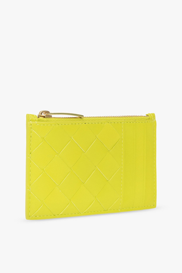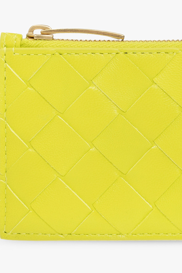 Light green card case from Bottega Veneta. Crafted from a blend including lamb leather and calf leather, this design showcases the brand\'s iconic Intrecciato weave, an embossed logo, gold-tone metal hardware, one zip pocket and three card slots.