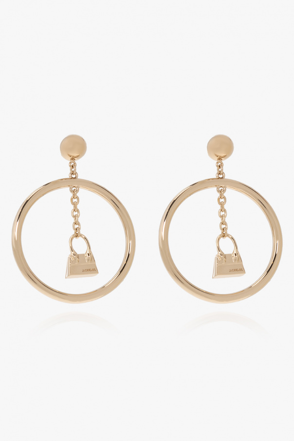 Light gold-tone hoop earrings from Jacquemus. Made from an aluminum, brass and bronze alloy, they secure with logo-engraved push back closures and showcase logo-engraved ‘Le Chiquito’ bag charms.