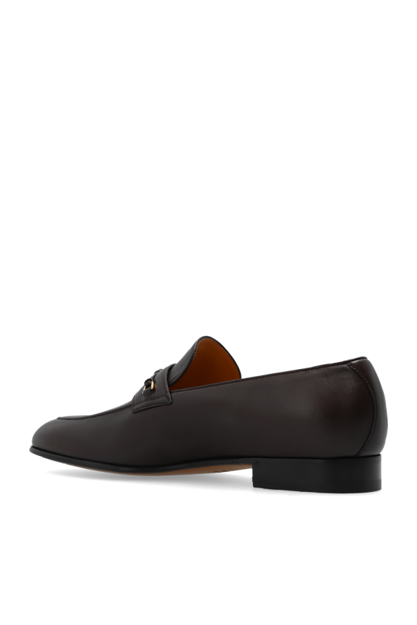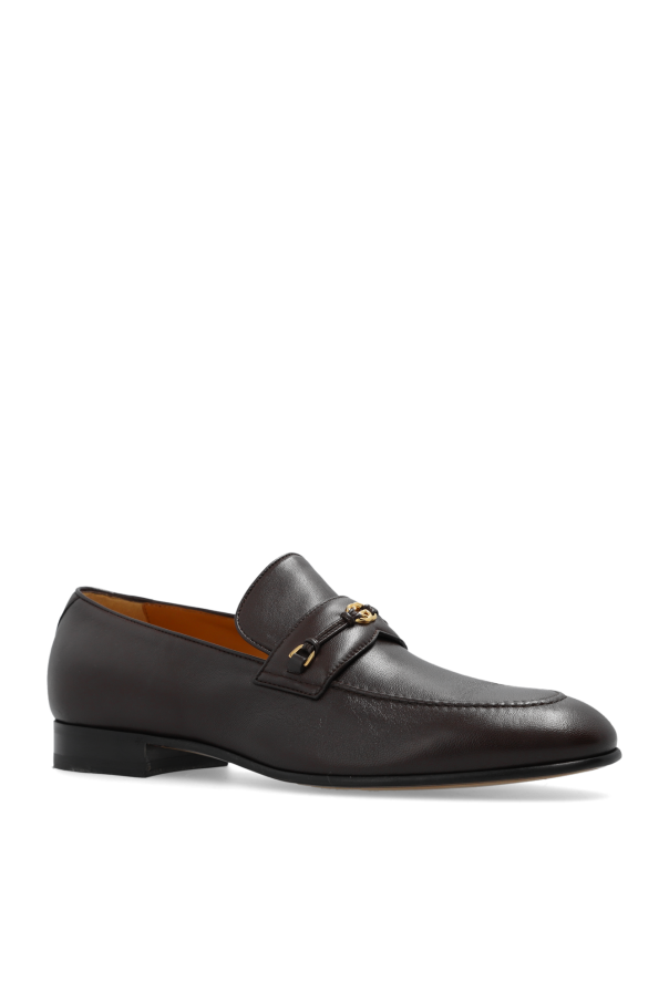 Brown loafers from Gucci. Made from leather, this model sits on a light brown leather sole and showcases a strap with Interlocking G hardware on the front.
