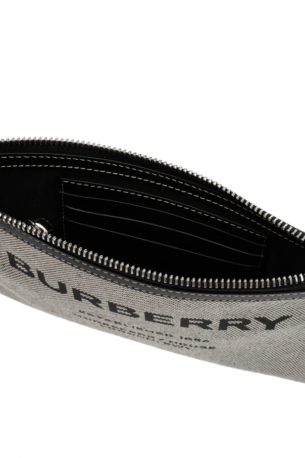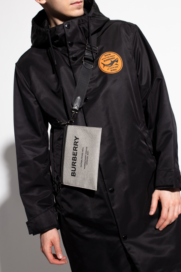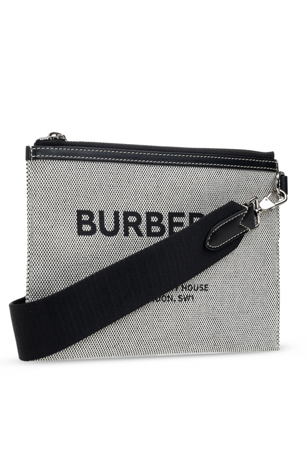 White and black shoulder bag from Burberry. Made from cotton, this design secures with a zip and showcases a black graphic print with the brand\'s logo, an adjustable shoulder strap, silver-tone metal hardware and one internal compartment with three card slots and one zip pocket.