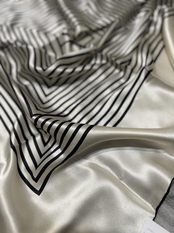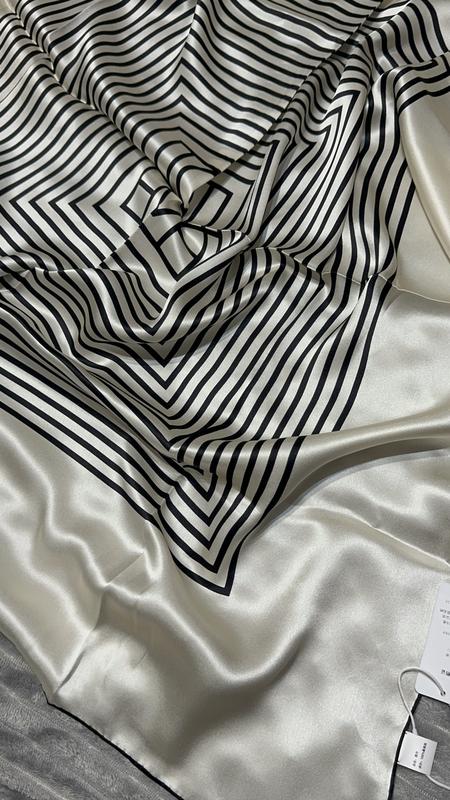 В наличии платок из 100% натурального китайского шелка, в размере 90x90. Очень приятная и мягкая ткань, нежная, приятно носить как на голове так и на шее.