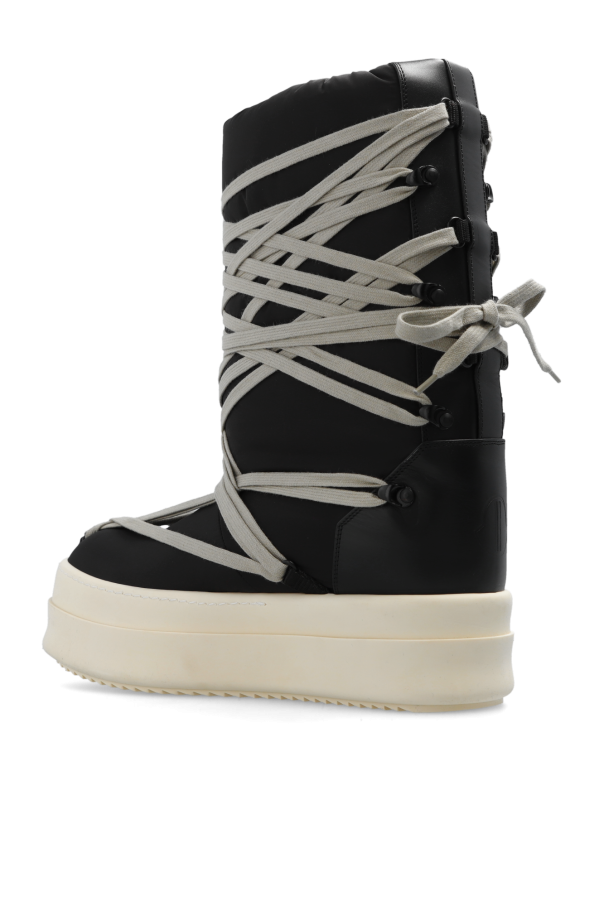 Black snow boots from Rick Owens x Moncler. Sitting on a cream rubber sole, this model showcases an embossed logo and decorative grey laces.