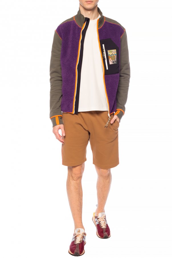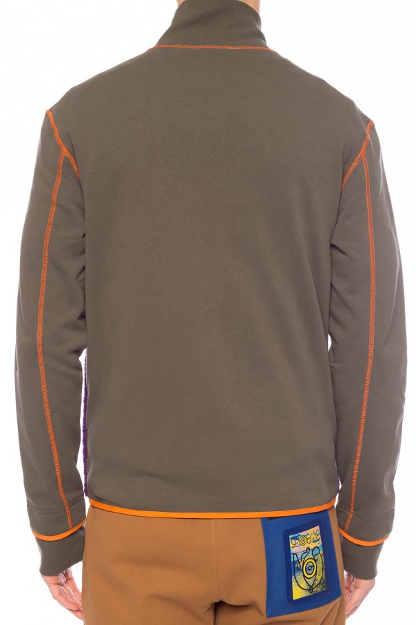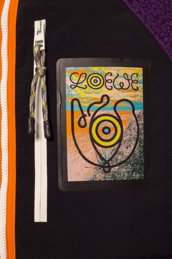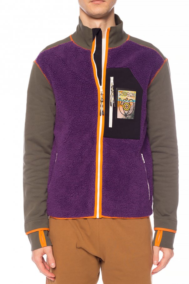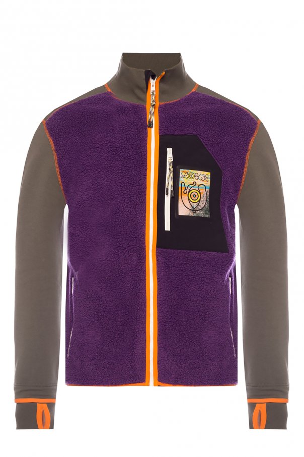 Green and purple furry sweatshirt with a band collar from Loewe, 'Eye/LOEWE/Nature' collection. Zip fastening. Two zip pockets and a pocket decorated with a logo patch. Elasticated sleeves.