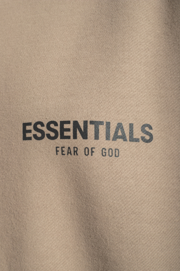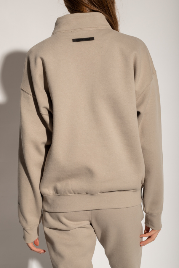 Beige and grey sweatshirt with a standing collar from Fear Of God Essentials. Crafted from cotton jersey, this style features an elasticated bottom hem and cuffs, a dark grey graphic print and a logo appliqué at the back.
