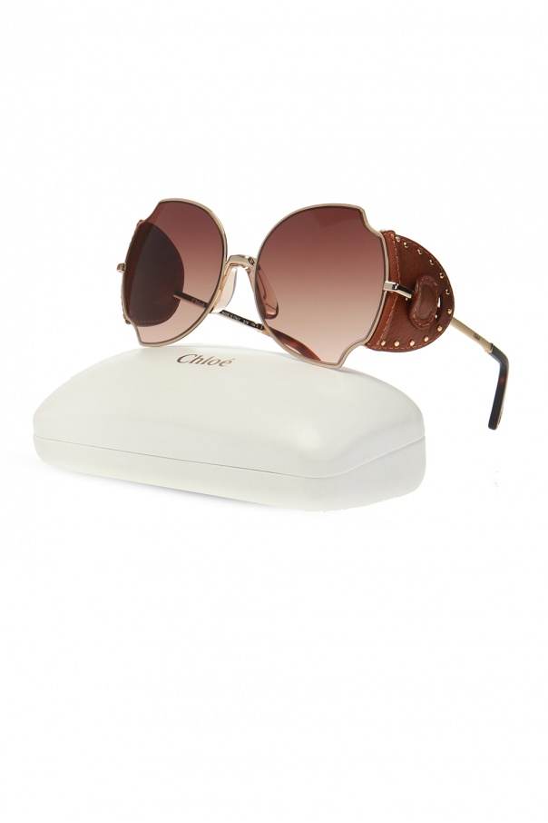 Gold-tone and brown ‘Deva’ sunglasses from Chloé. Signature cut-out detailing at the tips. Sides decorated with logo-embossed leather inserts. Brown gradient lenses with 100% protection against UVA/UVB rays. Item comes with a protective case and a cleaning cloth.