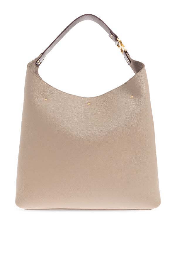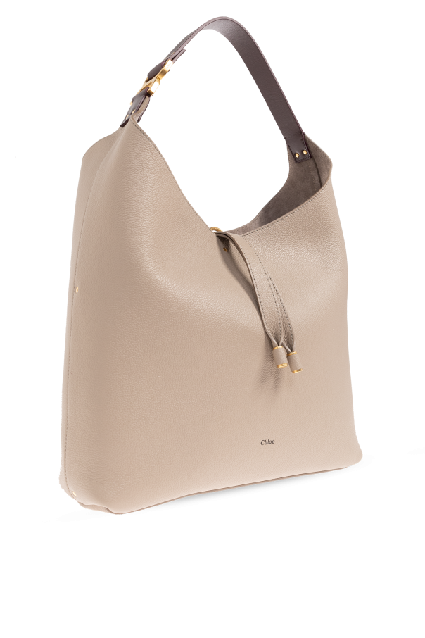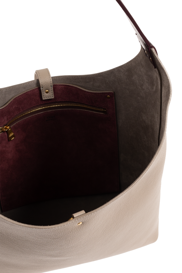 Dark grey and maroon ‘Marcie’ hobo shoulder bag from Chloe. Made of grained calf leather, this design secures with a fringed slide fastener and showcases an embossed logo on the front, one short handle with a metal application, gold-tone metal hardware and one internal compartment with a zip pocket.