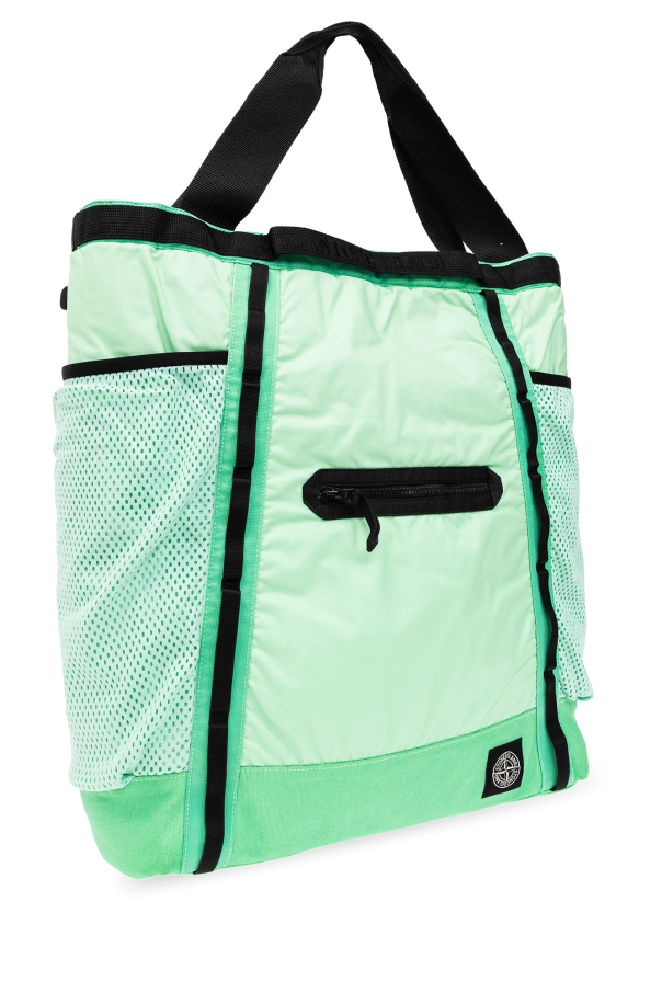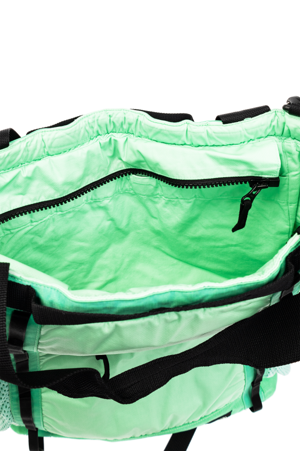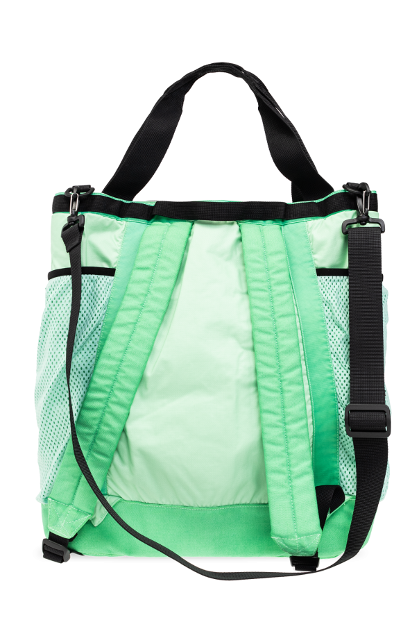 Green and black backpack from Stone Island. Made of cotton, this design fastens with a zip and features a logo patch on the front, one zip pocket on the front, two slip pockets on the sides, two half-round handles, adjustable shoulder straps, an adjustable and detachable strap, and one internal compartment with a velcro-fastened pocket. Can be worn as a shoulder bag.