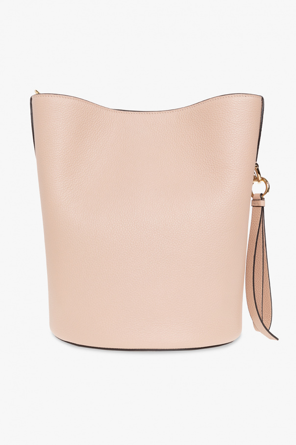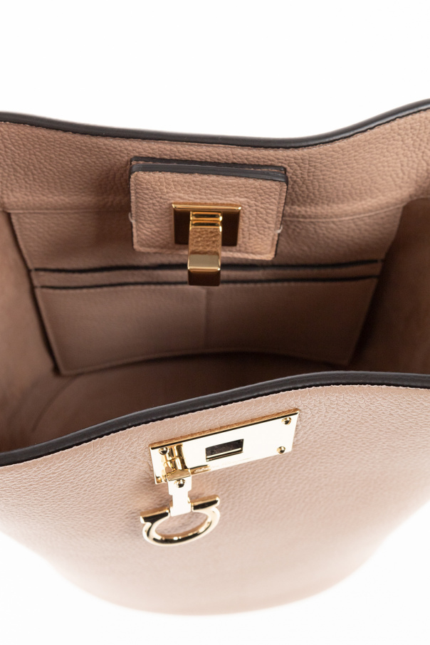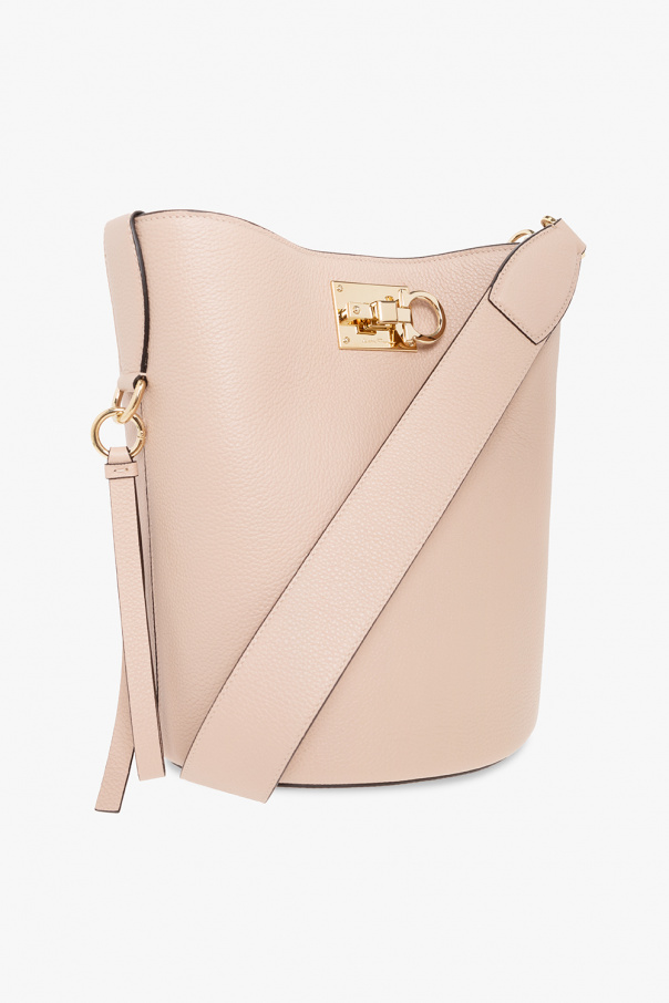 Pinkish beige ‘The Studio’ shoulder bag from Salvatore Ferragamo. Crafted from calf leather, this design secures with a snap and showcases an embossed logo, a shoulder strap, gold-tone metal hardware and one internal compartment with two slip pockets.