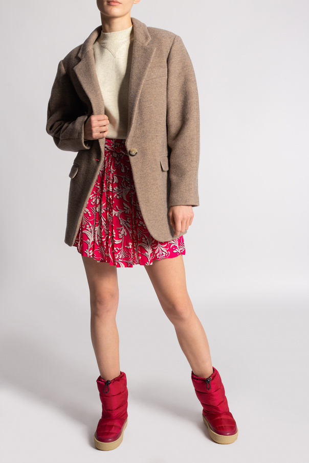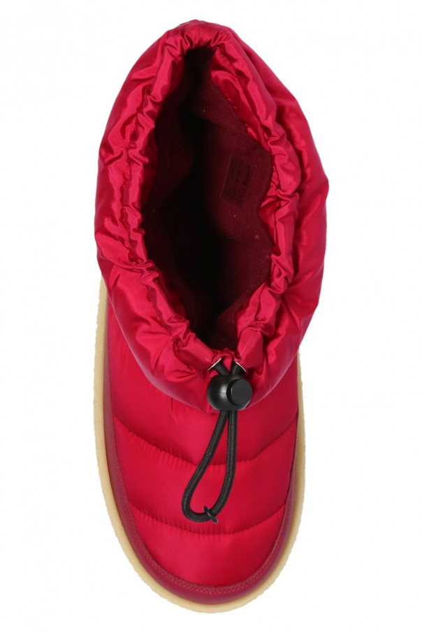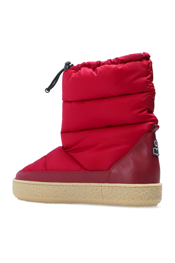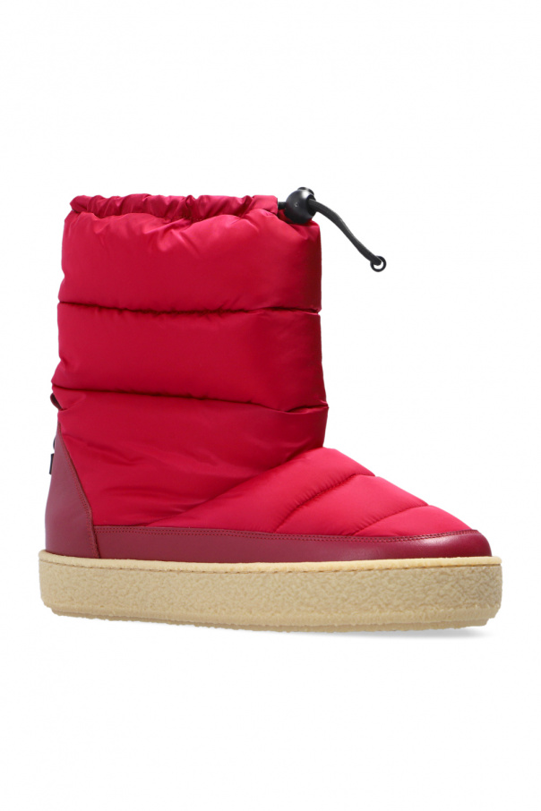 Pink ‘Zerik’ snow boots from Isabel Marant. Finished with maroon leather, this model sits on a beige rubber sole and features a drawstring closure and a rubber logo appliqué on the back.