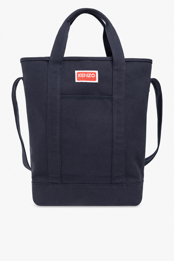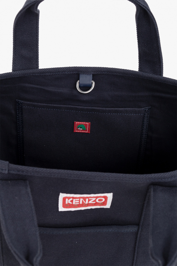 Navy shopper bag from Kenzo. Made of cotton, this garment features a carabiner hook, multicolored embroidered KENZO Poppy pattern, green logo print, back pocket, two half-round handles, shoulder strap, silver-tone metal hardware and one internal compartment with one slip pocket.