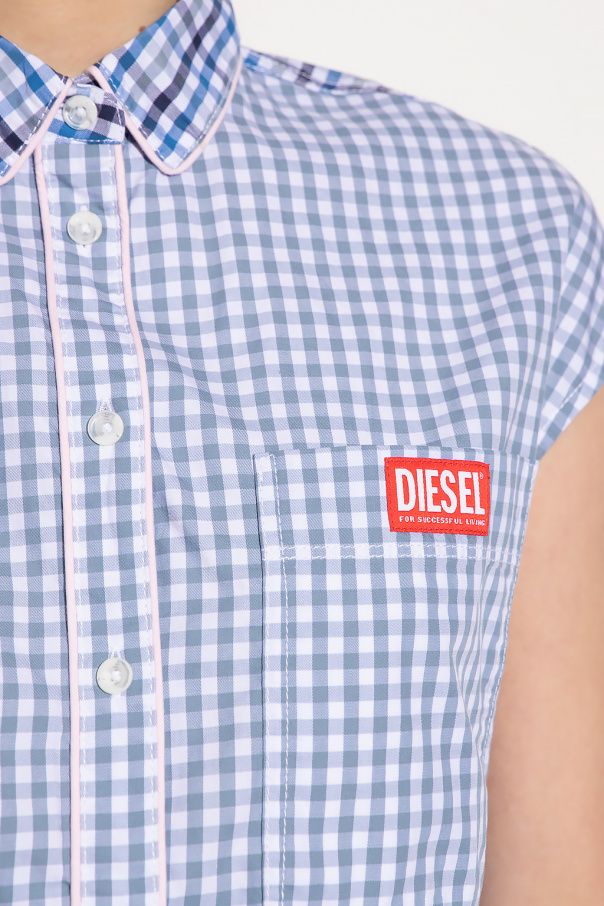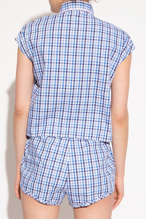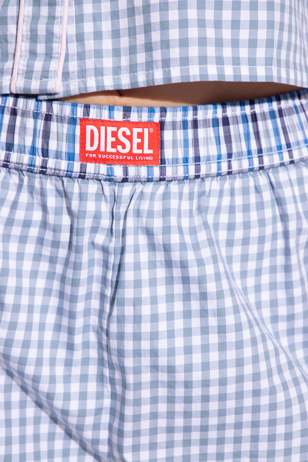 Blue, white and navy blue ‘UFSET-VENELIA-WS’ two-piece pyjama from Diesel. Made from cotton with a check pattern, this ensemble includes a top with button fastenings, a logo patch and a slip chest pocket and bottoms with an elasticated waistband.