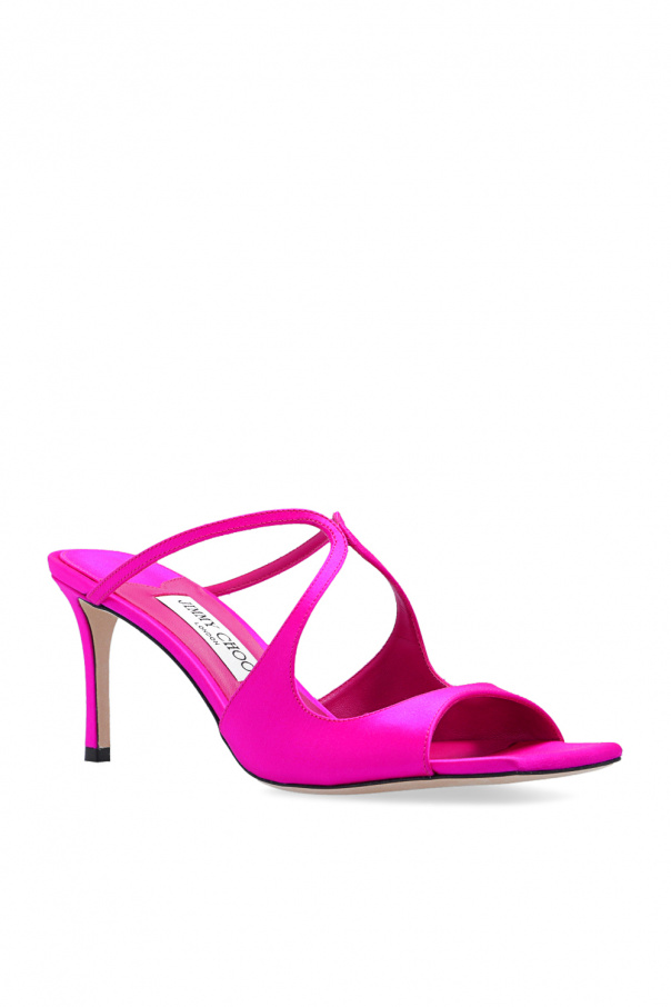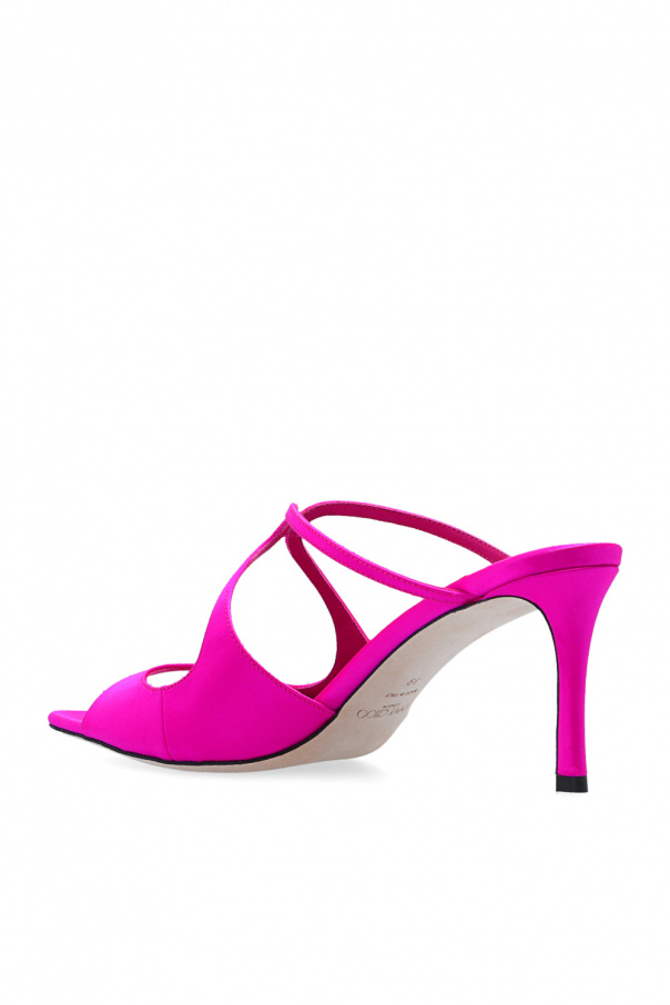 Dark pink ‘Anise’ mules from Jimmy Choo. Crafted from satin, this model features a decorative cut-out upper and a beige leather sole.
