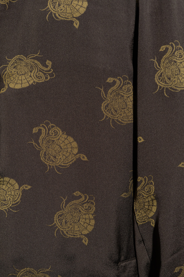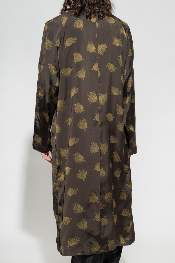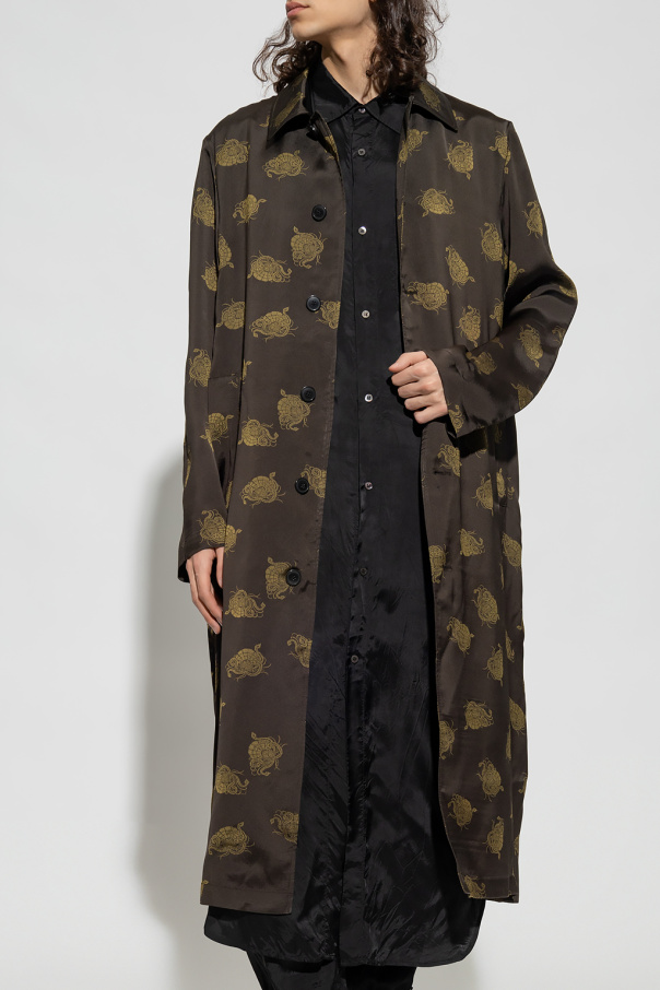 Dark green coat from Dries Van Noten. Crafted from a silk blend, this style showcases an animal motif, button fastenings, two slip pockets, long sleeves and a single back vent.