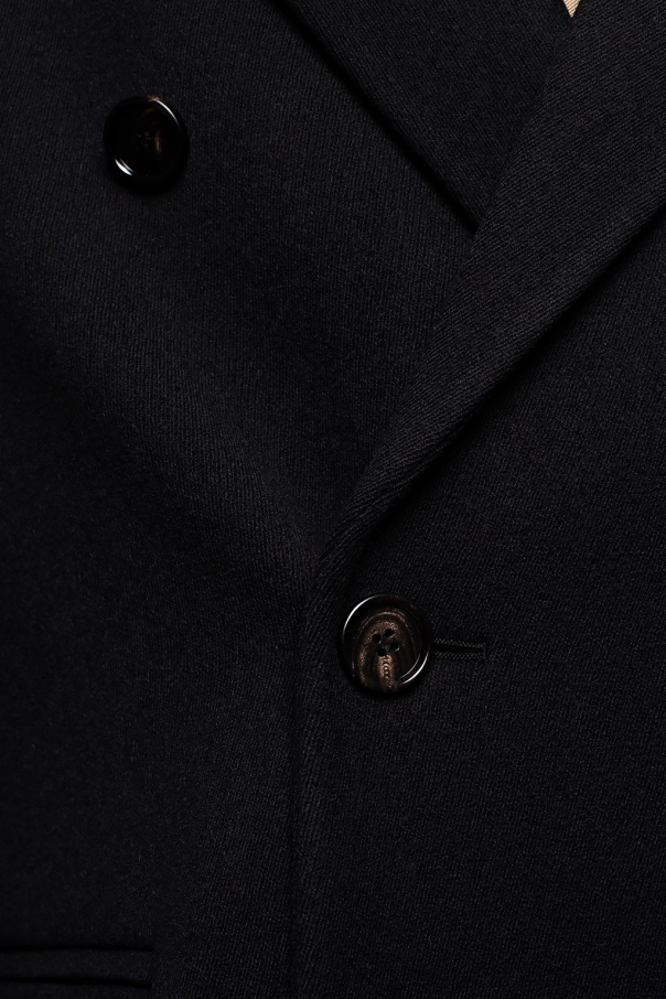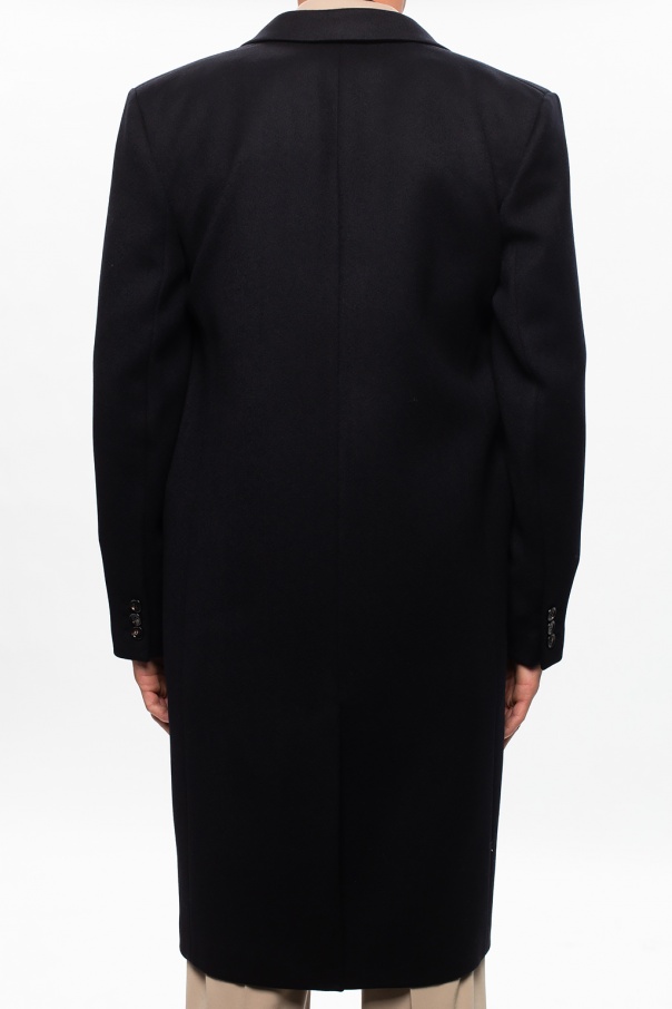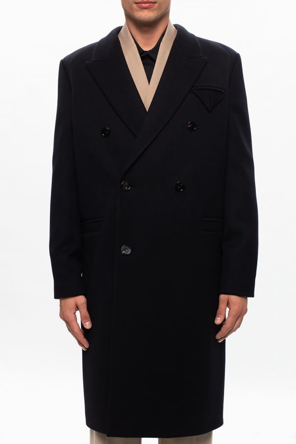 Black coat from Bottega Veneta. Crafted from woo, this double-breasted piece of outerwear is complete with button closing and three front pockets.
