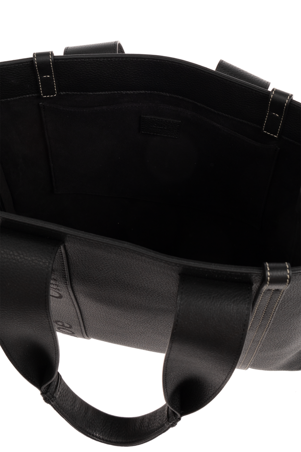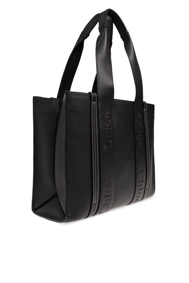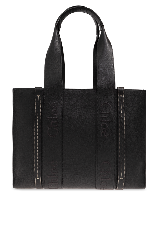 Black ‘Woody Large’ shopper bag from Chloe. Made of denim with black leather trims, this model features a logo embroidery, two half-round straps, light gold-tone metal hardware and one internal compartment with one slip pocket.