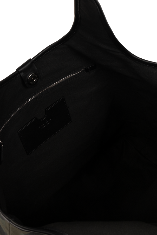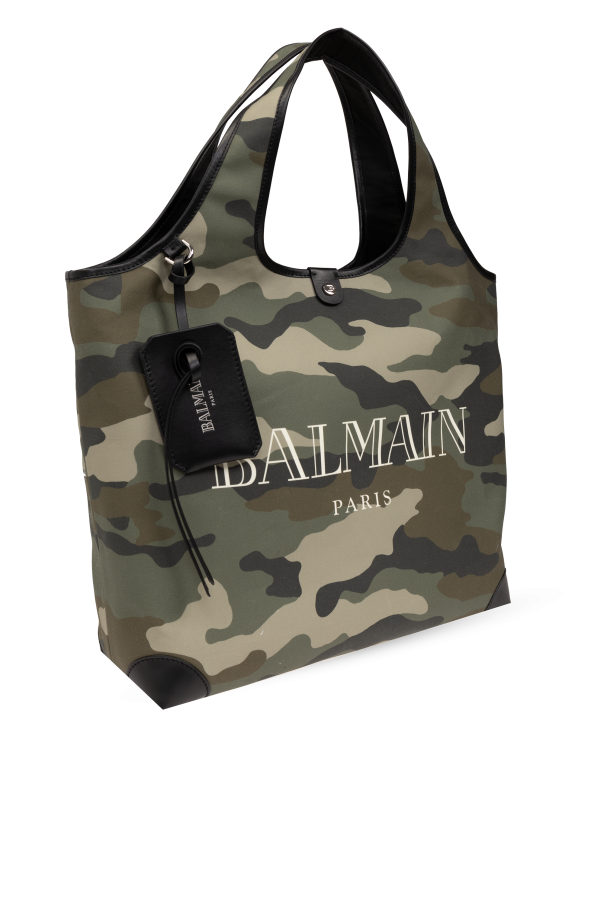 Introducing the \'B-Army\' shopper bag from Balmain, a testament to the fusion of functionality and high fashion. Emblazoned with the iconic BALMAIN PARIS logo in stark white against a meticulously crafted camouflage pattern in shades of green, this piece is an epitome of masculine elegance and trend-setting style. Crafted from a luxurious blend of cotton canvas and calf leather, with a sleek black interior, this bag is not only a visual delight but also a tactile treasure. The B-Army shopper boasts ample, comfortable handles, designed for versatility — easily slung over the shoulder or carried by hand. Its spacious, single-compartment interior, accented with a discreet inner pocket, ensures practicality for daily essentials, while the magnetic snap closure guarantees security with effortless access. An accompanying black strap with a designer logo charm adds a distinctive touch of Balmain\'s identity. The bag\'s exterior, adorned with a camouflage motif and complemented by silver-toned metal finishes, speaks volumes of its owner\'s discerning taste for luxury with an edge. Whether it\'s for a day out in the city or a casual business meeting, the \'B-Army\' shopper stands out as a statement accessory. Why Choose This Product? Exclusive camouflage design with BALMAIN PARIS logo showcases high-fashion aesthetic. Constructed from high-quality cotton canvas and calf leather, ensuring durability and style. Spacious interior with secure magnetic closure and additional inner pocket for organization. Versatile carrying options with long, comfortable handles and a unique designer charm strap. Silver-toned metal finishes enhance the bag\'s sophisticated, masculine allure.