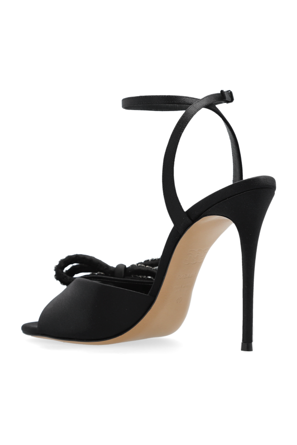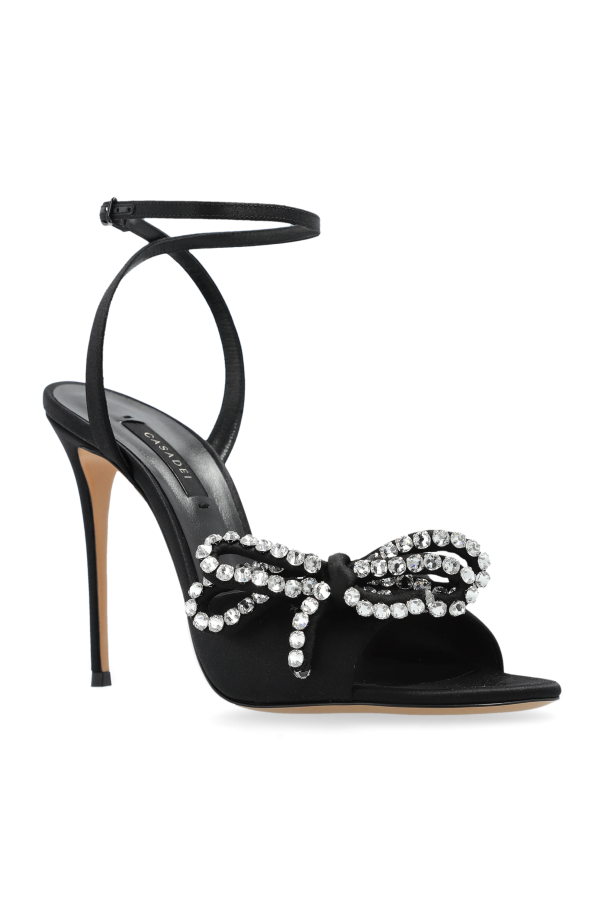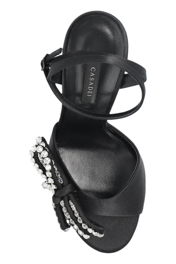 Introducing the exquisite Judith sandals by Casadei, a masterpiece of elegance and sophistication. These black high-heeled sandals are crafted from a glossy, smooth material, reminiscent of satin. The slender stiletto heel elevates your silhouette, while a delicate ankle strap ensures a secure fit. Adorning the front is a resplendent bow embellished with shimmering crystals, adding a touch of sparkle and distinction. The interior is thoughtfully cushioned, promising comfort with every step, and features the iconic \"CASADEI\" inscription on the insole. Why choose this product? Timeless black hue complements any evening attire. Crafted from luxurious materials for a sophisticated finish. Exquisite crystal-embellished bow for added glamour. Comfortable cushioned interior for all-day wear. Designed by the renowned brand Casadei, synonymous with passion and innovation.