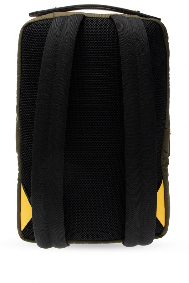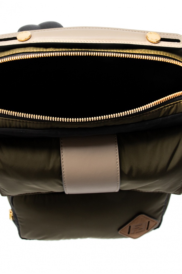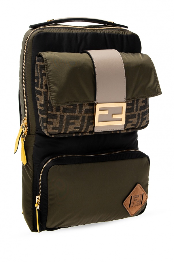 Black and green backpack from Fendi. Emblazoned with jacquard FF motif, this design fastens via zip closure and employs distinctive logo details, two pockets on the front, including zipped one and one with magnetic snap-button closure, a half-round handle, adjustable shoulder straps and interior with one compartment and one velcro-fastened pocket.