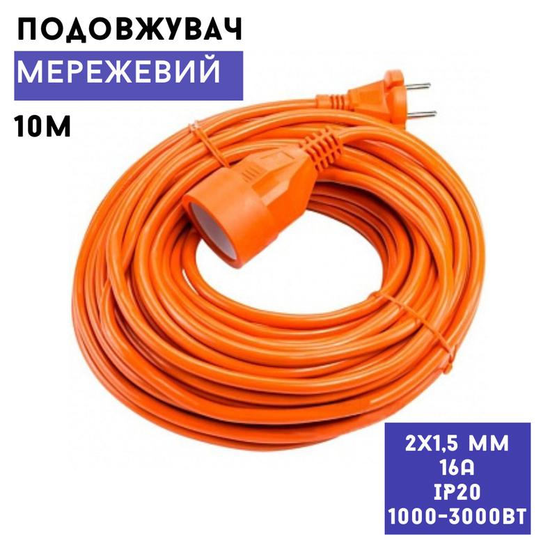 Электрический удлинитель длиной 10 м оснащен 1 розеткой, позволит подключить
