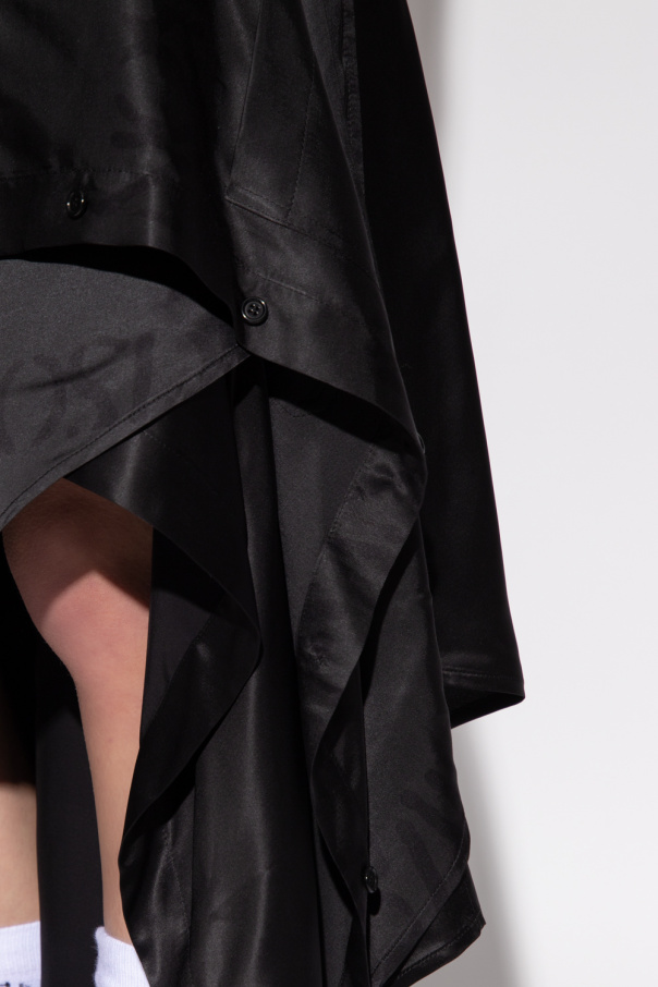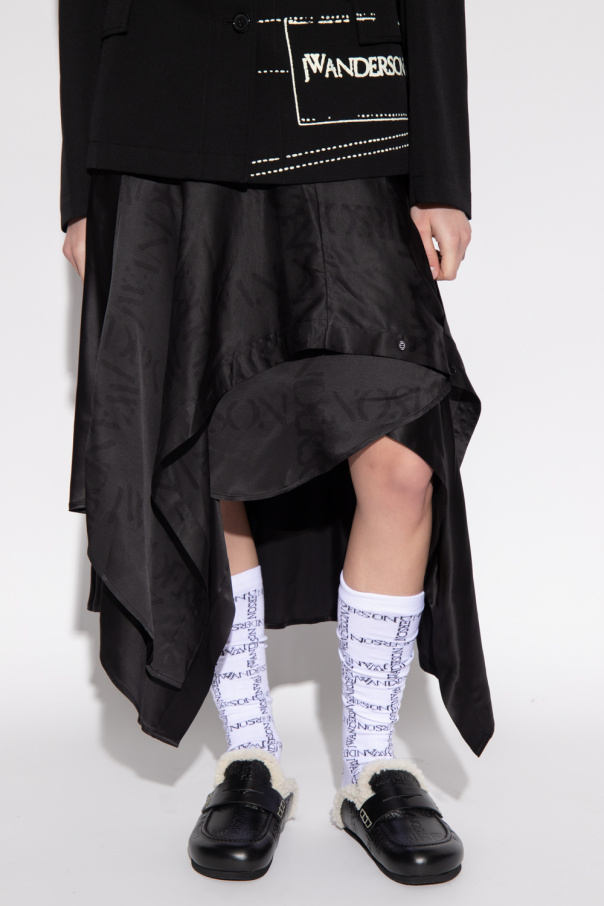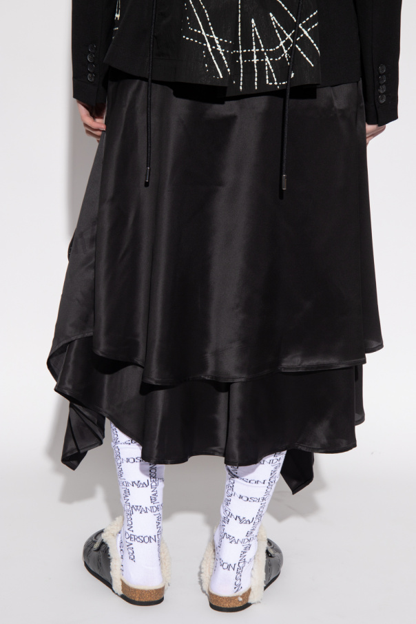 Dark green and black layered skirt from JW Anderson. Crafted from glossy satin emblazoned with digitally printed logo, this style features a drawstring waist, three slip pockets on the front and an asymmetrical hemline with buttons.