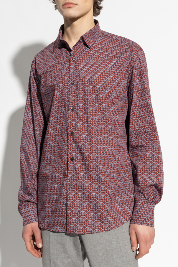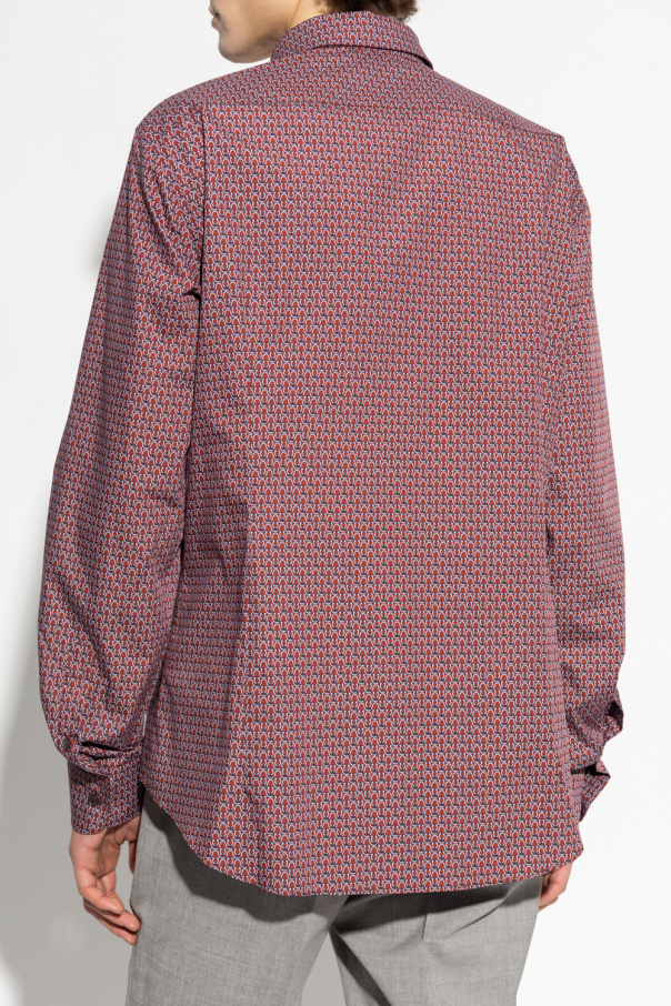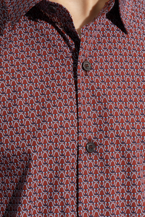 Brownish red shirt from FERRAGAMO. Made of cotton, this style showcases a navy blue and blue Gancini pattern, front button fastenings and long sleeves with button cuffs.