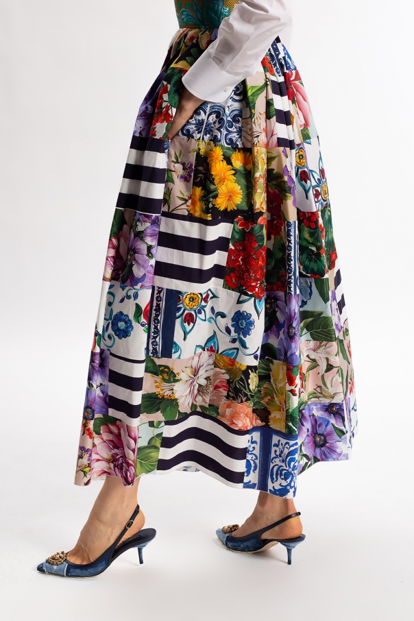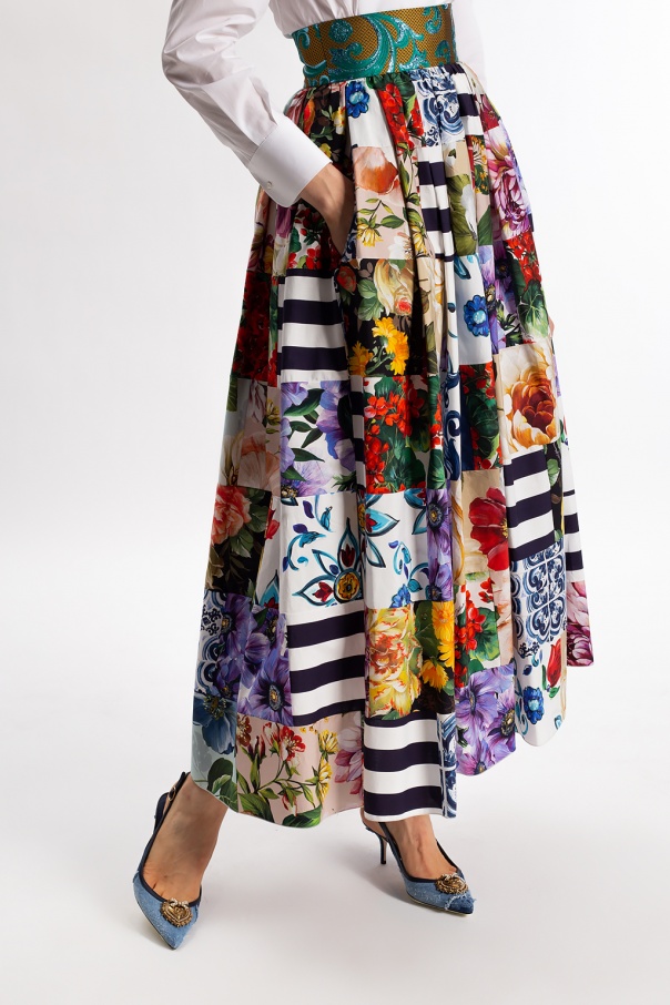 Multicolored flared skirt from Dolce & Gabbana. Fastened with a zip and snaps, this design features a floral pattern, blue lurex thread and a stripe pattern in navy and white.