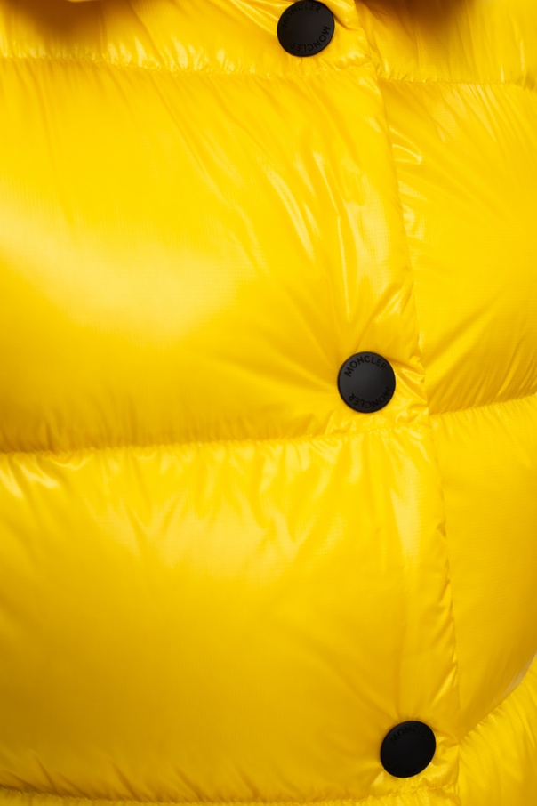 Yellow quilted hooded down vest from Moncler Grenoble. Fastened with a two-way zip and snaps, this garment is complete with a logo patch, two zip pockets and a drawstring hood.