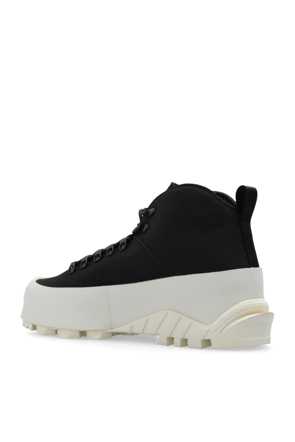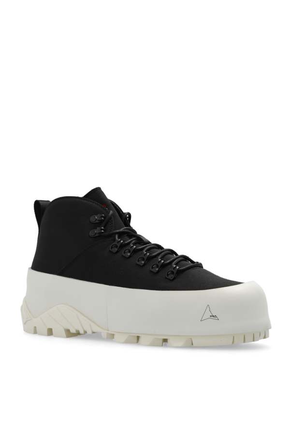 Black ‘CVO’ hiking boots from ROA. Crafted from fabric and leather with rubber trims, this lace-up pair features a logo embroidery on the tongue, logo print at the side, pull strap at the back and cream rubber Vibram® Megagrip tread sole with a pattern designed for optimal traction and to ensure high resistance to use on roughest surfaces.