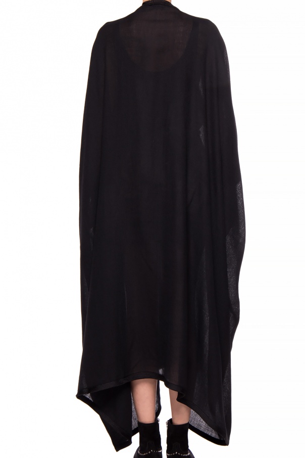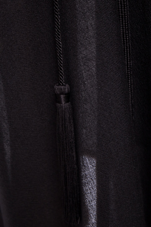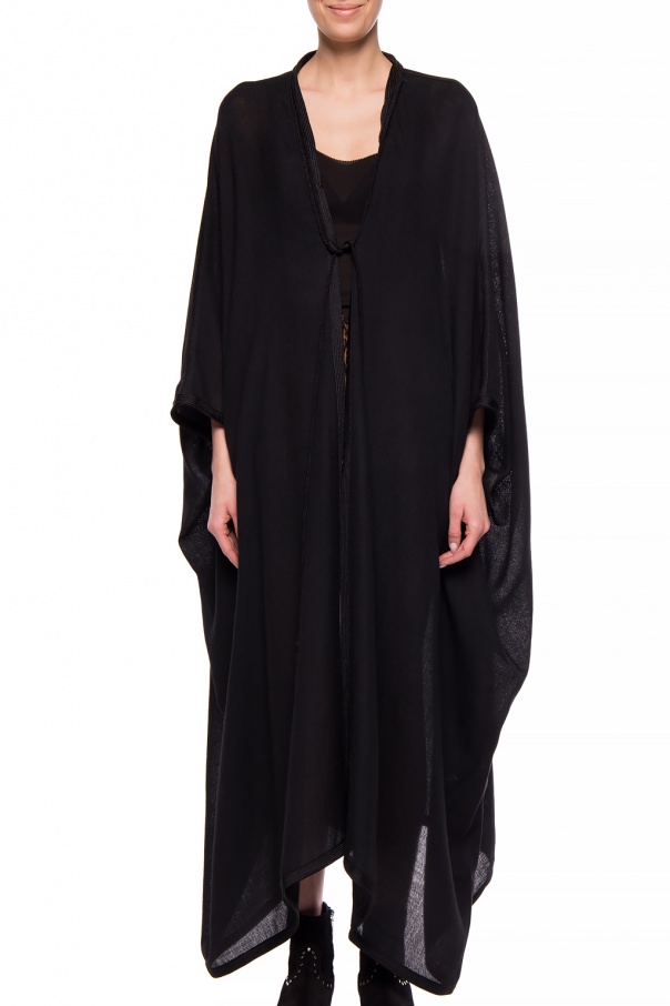 Black poncho with fringes from Saint Laurent. Decorative trim. Short flared sleeves.