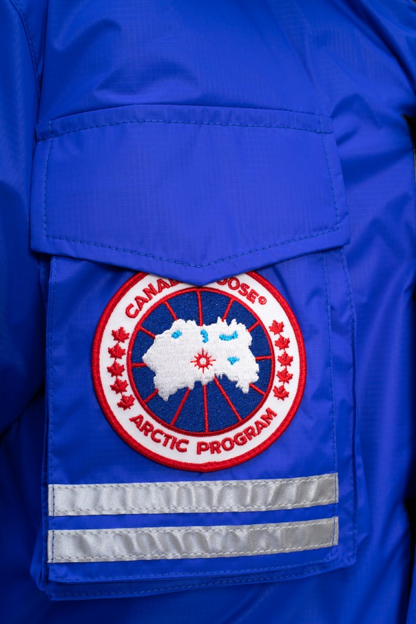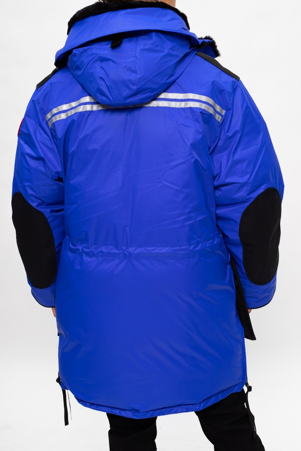 Blue ‘Snow Mantra’ jacket with a drawcord-adjustable hood from Canada Goose x Northern Lights, ‘The Icons’ collection. Crafted from an innovative and extremely lightweight ‘Iso Peak 2L’ material with water and windproof properties and padded with a duck down, this winter staple fastens via a zip and snap-buttons and employs two slip pockets, four velcro-fastened flapped pockets as well as detachable and reflective silver-tone details with a translucent pocket on the front, an additional zip pocket on the sleeve, elasticated trims to the cuffs and a logo patch for the brand recognition. Colours utilised in the collection were inspired by the auroras that decorate skies of the northern hemisphere.