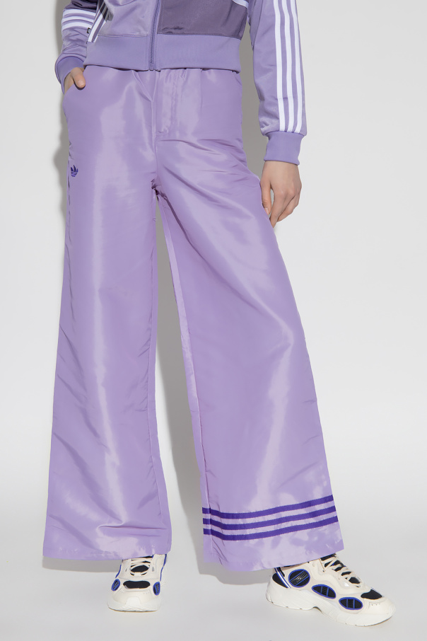 Purple trousers from ADIDAS Originals. This pair features an elastic waistband, zip and hook fastening, logo embroidery, three slip pockets and wide legs.