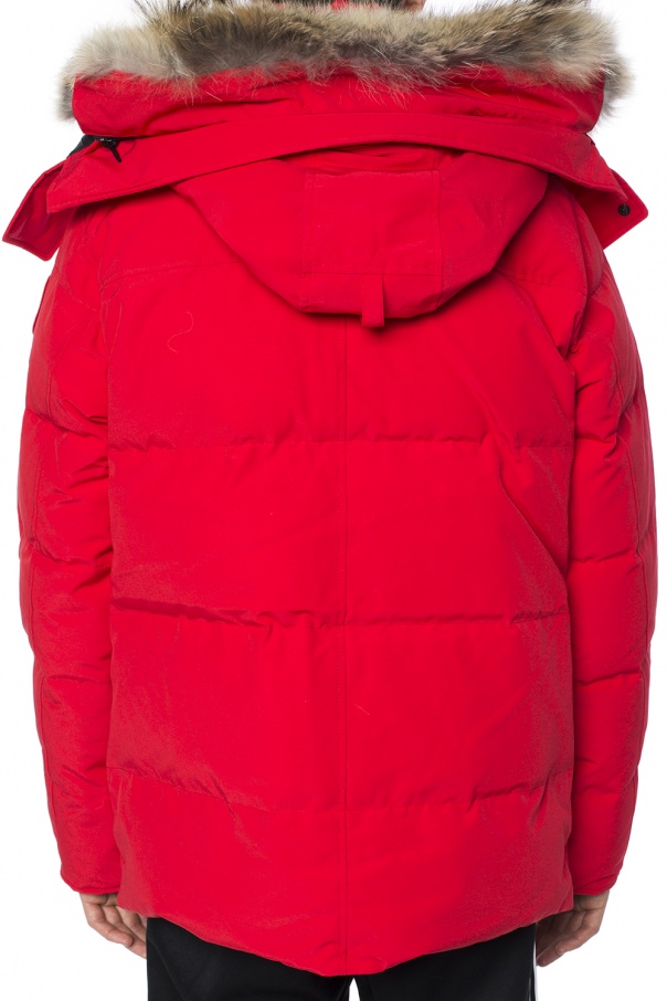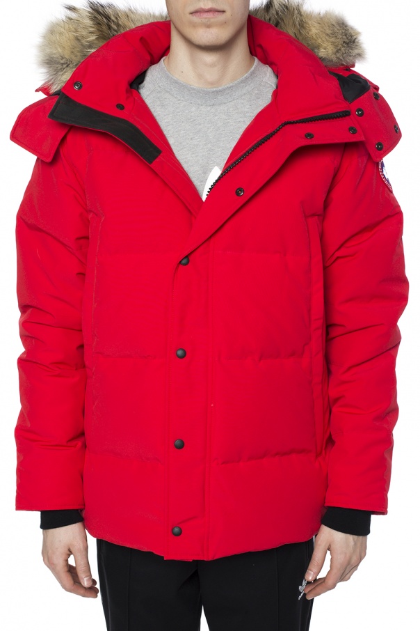 Red down jacket featuring drawstring hood from Canada Goose. Two-way zip and snap fastenings. Colourful logo patch at sleeve. 2 two-way zip pockets at front. Detachable coyote fur insert at hood. 2 slip pockets at sleeve. Long sleeves with elasticated cuffs. Metal hardware with elastic trims.