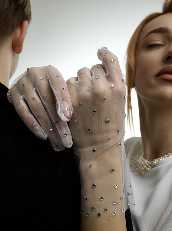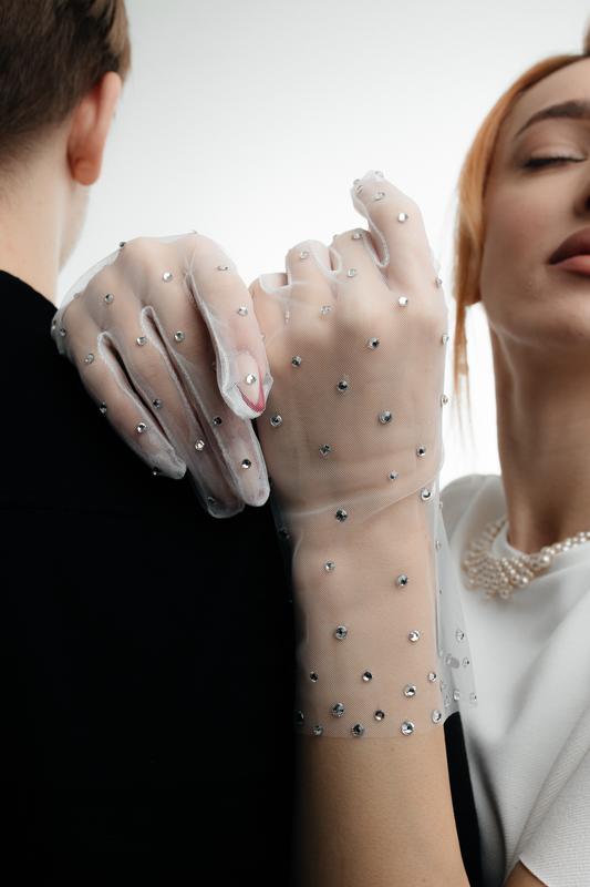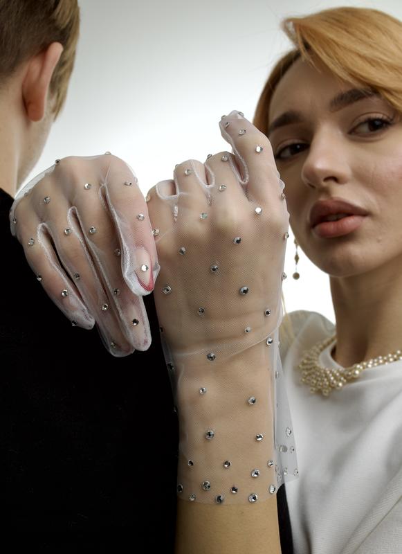 Перчатки стрейч-фатин со стразами. Стразы приклеены силиконовым клеем, который не желтеет и не отклеивается. (Ручная работа). Перчатки хорошо тянутся, (один размер) и очень приятны к телу. Заказывай себе такой аксессуар, и дополни образ на свадьбу, фотосессию или вечеринку.