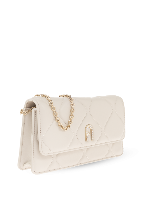 Cream ‘Diamante Mini’ shoulder bag from Furla. Made of leather, this design features a logo detail embellished with crystals, detachable chain, gold-tone metal hardware and one internal compartment with one zip pocket and one slip pocket.