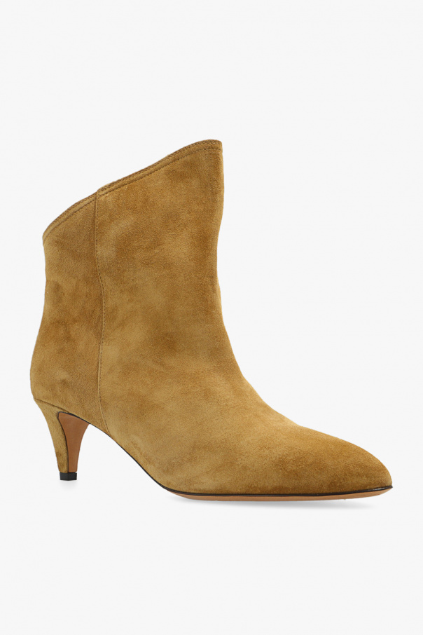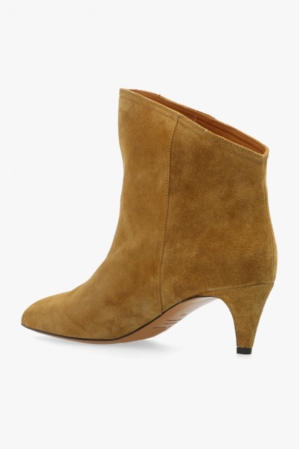 Khaki ‘Dripi’ heeled ankle boots from Isabel Marant. Crafted from calf suede, this slip-on pair features an asymmetric upper, pointed toe and beige leather sole.
