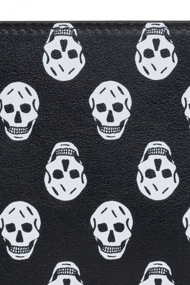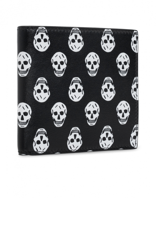 Black bi-fold wallet from Alexander McQueen. Made of calf leather and decorated with the brand\'s signature skull motif in white, this design features two bill compartments, two slip pockets and eight card slots.