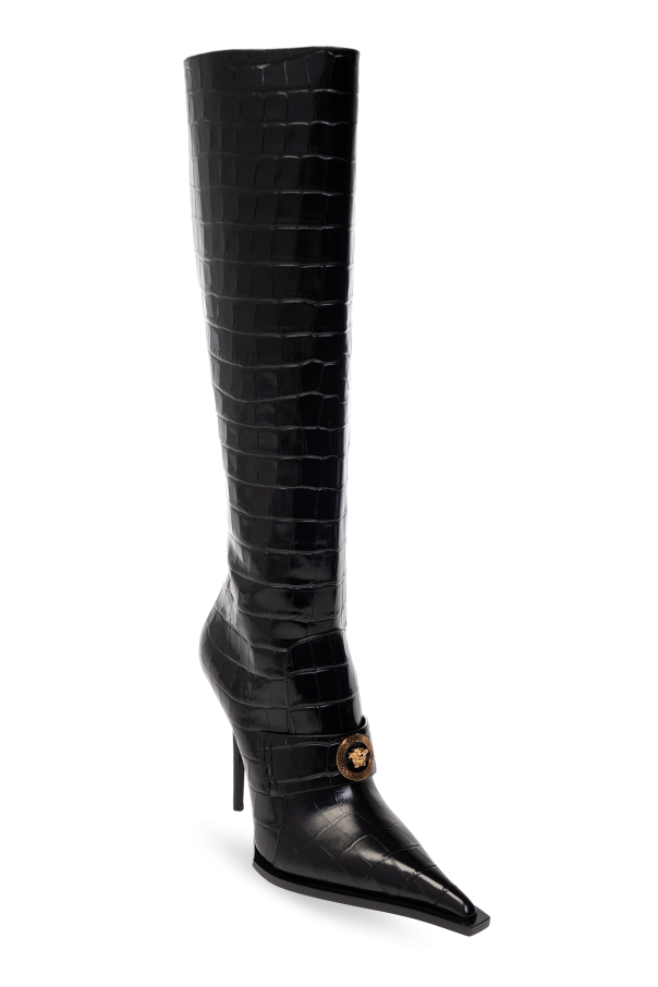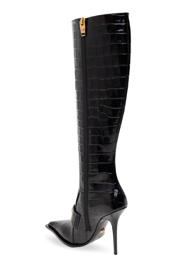 Black heeled boots from Versace. Made of patent leather with a crocodile skin effect, this pair features a side zip, the brand’s signature Greek pattern and Medusa head in gold-tone and black as well as a pointed toe and a black leather sole.
