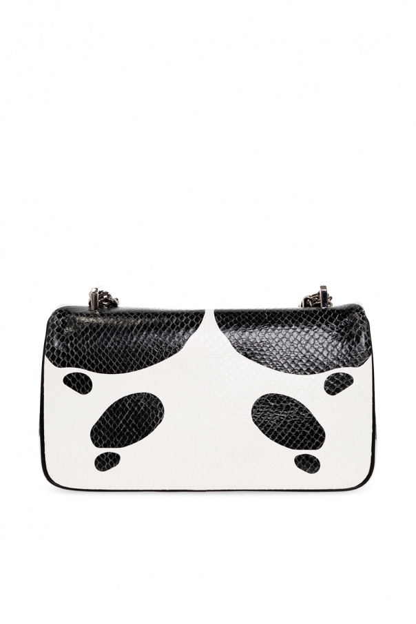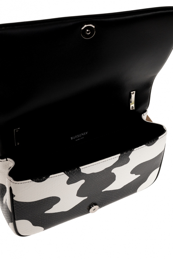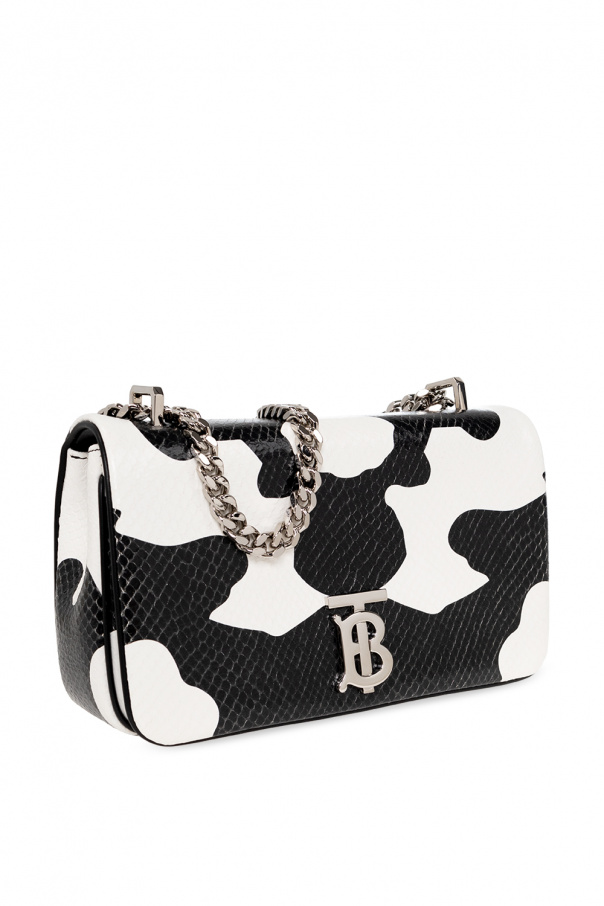 White and black ‘Lola Small’ shoulder bag from Burberry. Crafted from calf leather with a snakeskin effect, this model features a magnetic snap, metal logo appliqué, animal pattern, shoulder strap with chain inserts, silver-tone metal hardware and one internal compartment with one slip pocket.