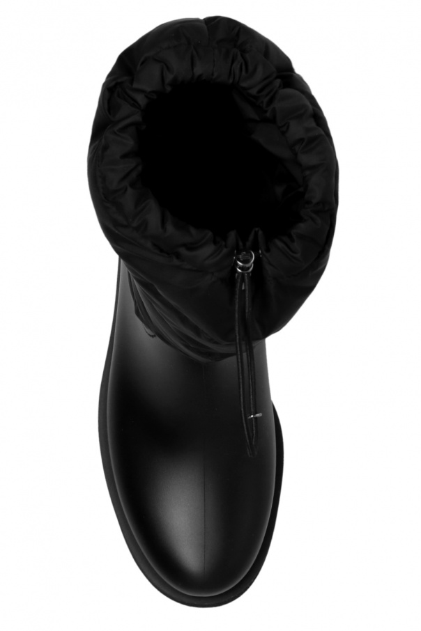 Black ‘Ginette’ rain boots from Moncler. Fastened with drawstrings, this model features down trims, a rubber logo patch and black rubber sole.