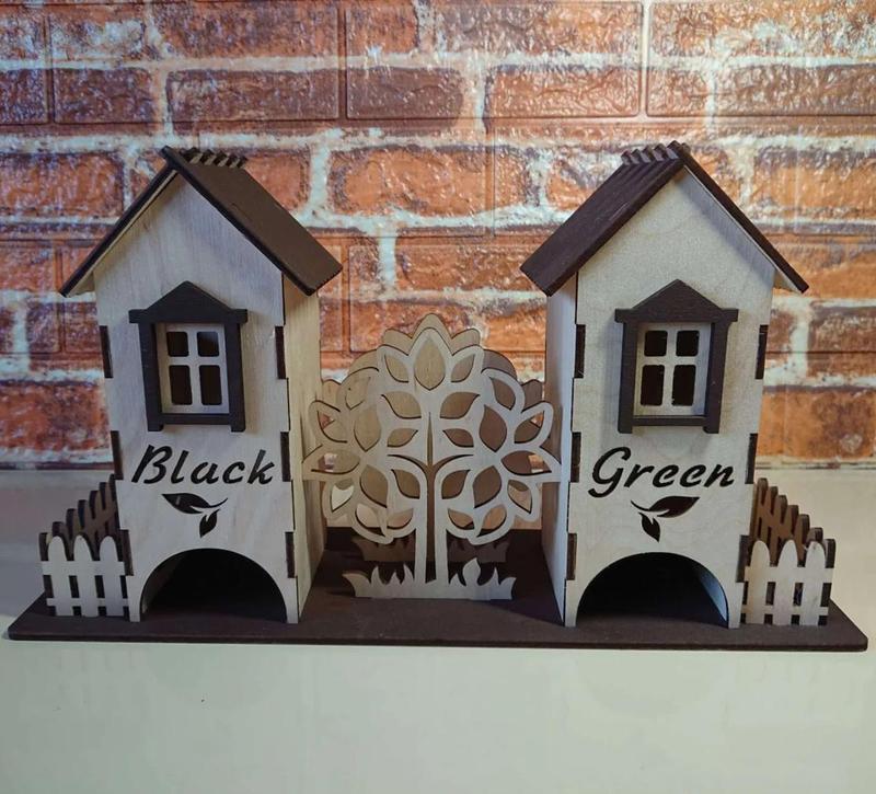 Домики для зеленого и черного чая в пакетиках, рядом салфетница в виде дерева