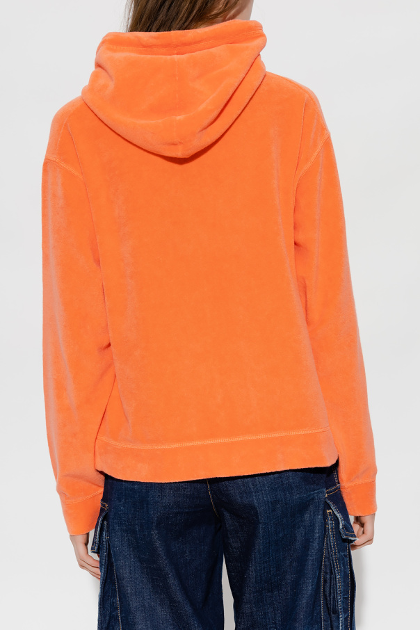 Orange hoodie from Dsquared2. Made of cotton terry, this long sleeve design features a drawstring hood, green logo print and ribbed trims at the hem and cuffs.