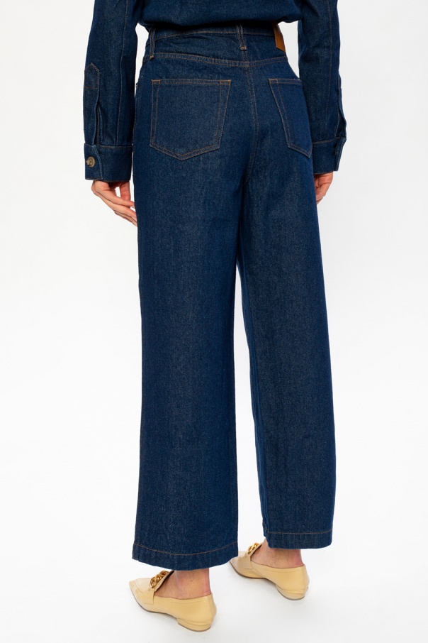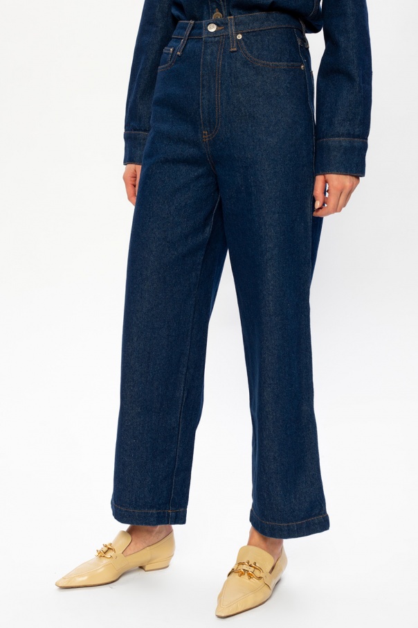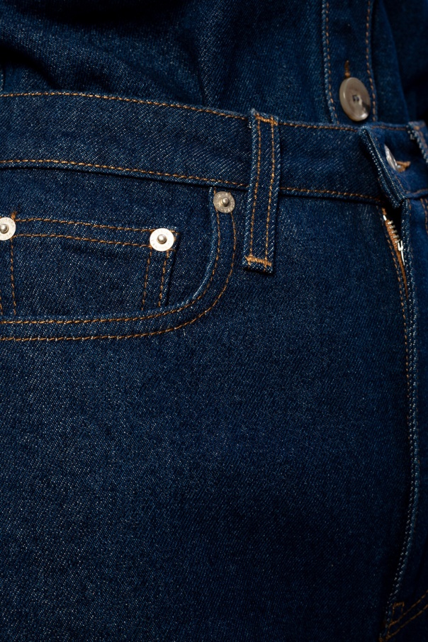 Dark blue ‘Jane’ jeans from Nanushka. Cut from cotton denim with a silhouette which sits high on the waist, this pair falls own with wide, straight legs and employs a zip fly, a single button fastening, five pockets and silver-tone metal fittings.