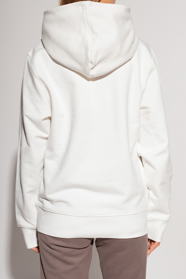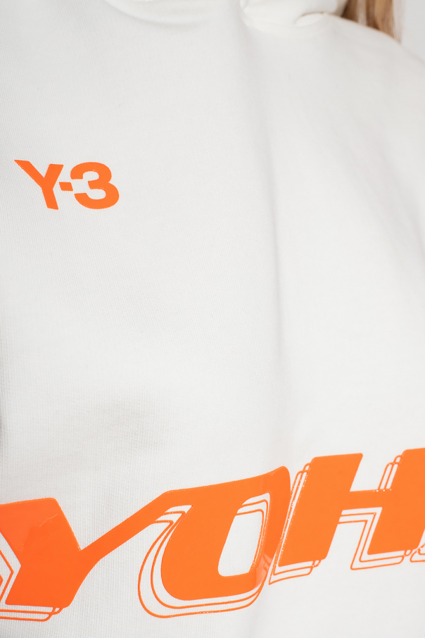 White sweatshirt from Y-3 Yohji Yamamoto. Crafted from cotton, this garment features an orange logo print and ribbed trims at the hem and cuffs.