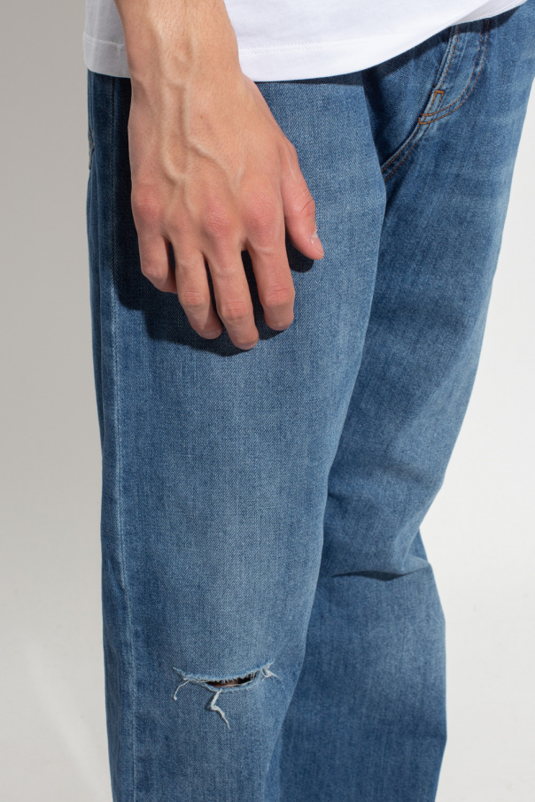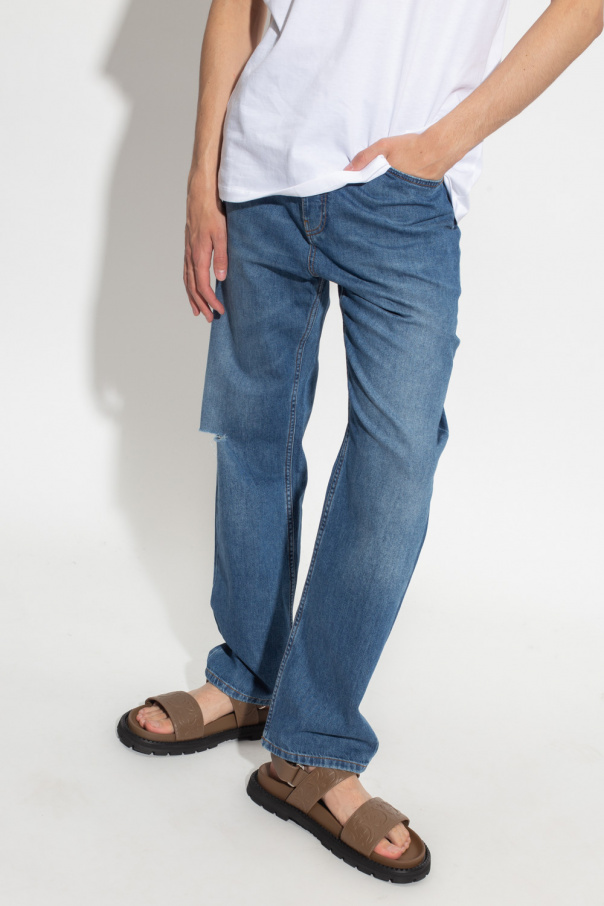Blue jeans from Loewe. Crafted from cotton, this straight leg design is complete with button fastenings, five slip pockets and black logo-embossed patch on the back.