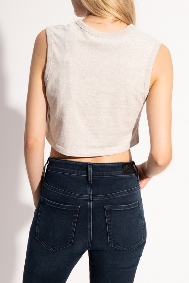 Grey sleeveless top from Diesel. Crafted from cotton, this garment features a printed logo pattern in black and a ribbed round neck.